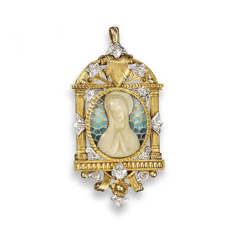 An Art Nouveau religious pendant, centred with a carved ivory figure of the Virgin Mary on plique-à-jour ground. The gold frame in the classical manner with architectural columns forming the frame. With foliate decoration and set with small diamonds. Acanthus border to the base. 6.5cm high.