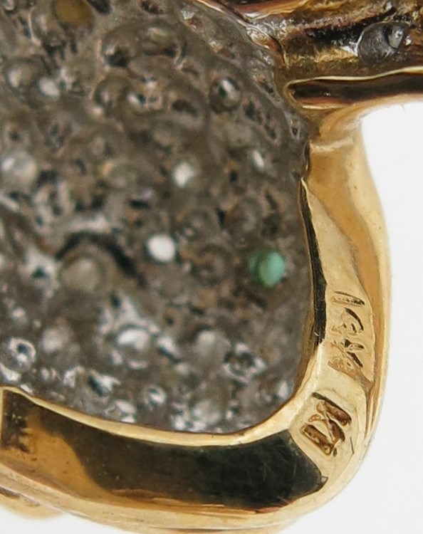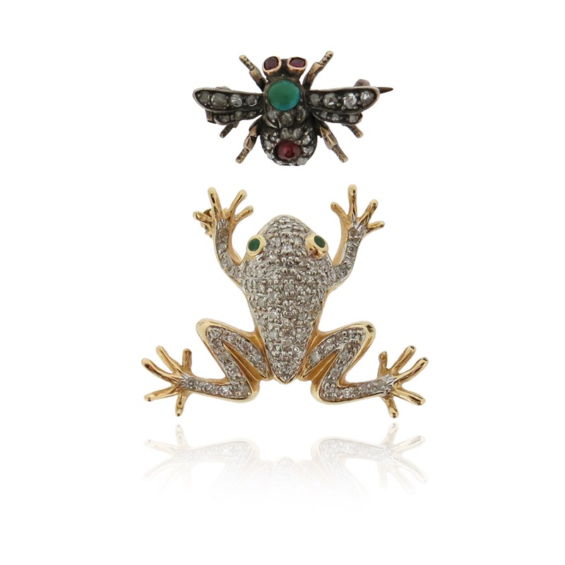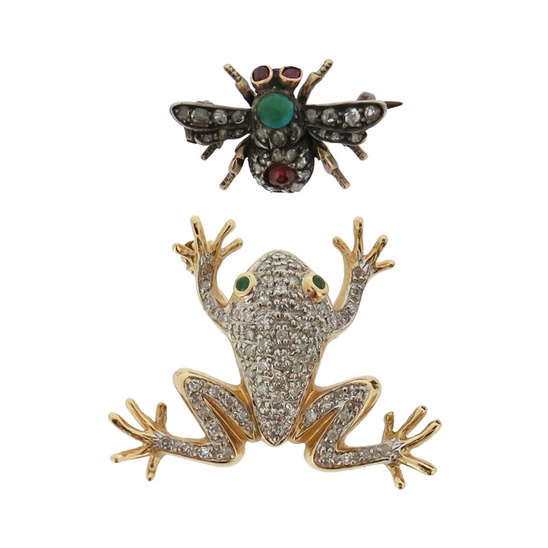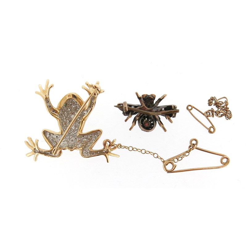 A 19th century gem-set insect brooch, set with rubies, diamonds and a turquoise in silver and gold, 2cm wide. With a gold frog, pave-set with diamonds and emerald eyes, 3cm wide
