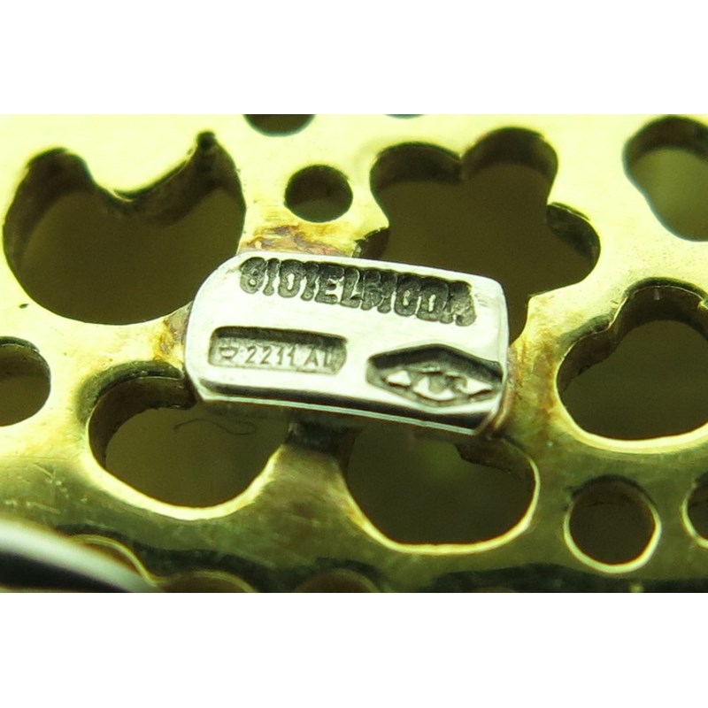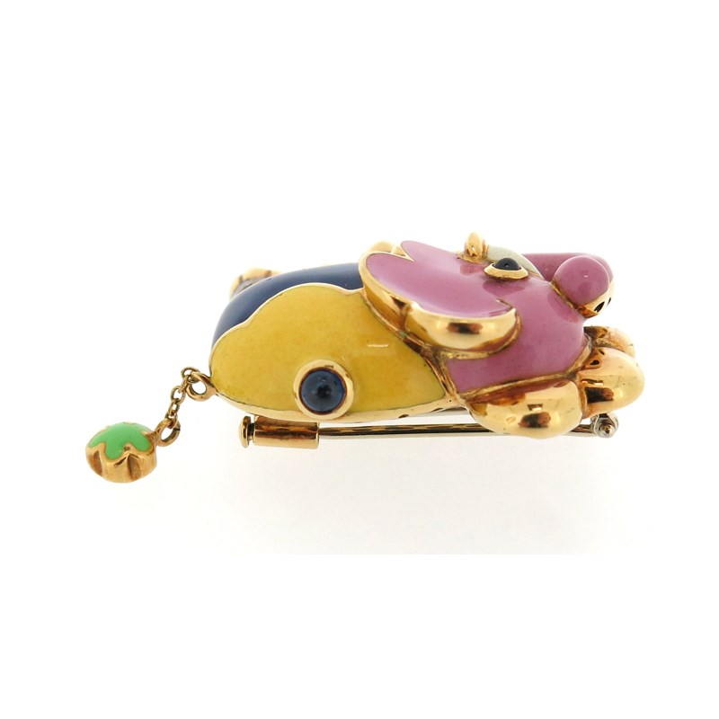A gold and enamel elephant brooch, decorated with polychrome enamel and cabochon sapphires in yellow gold, with an articulated tail, signed Bioielmoda with Italian marks, 4cm wide