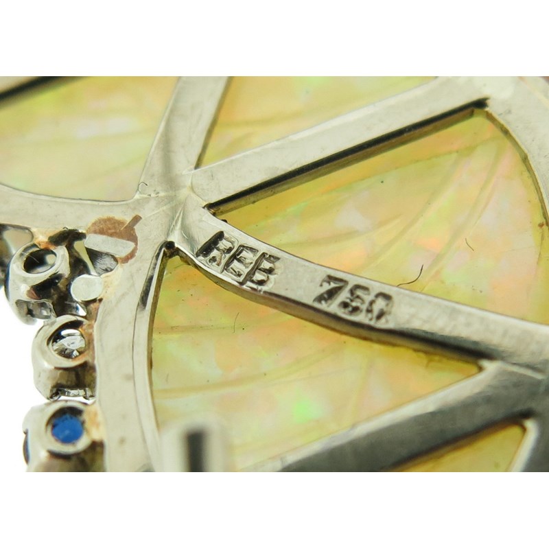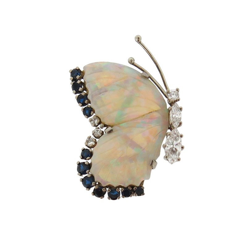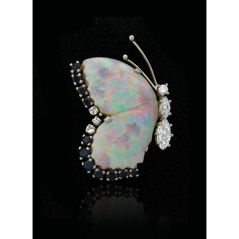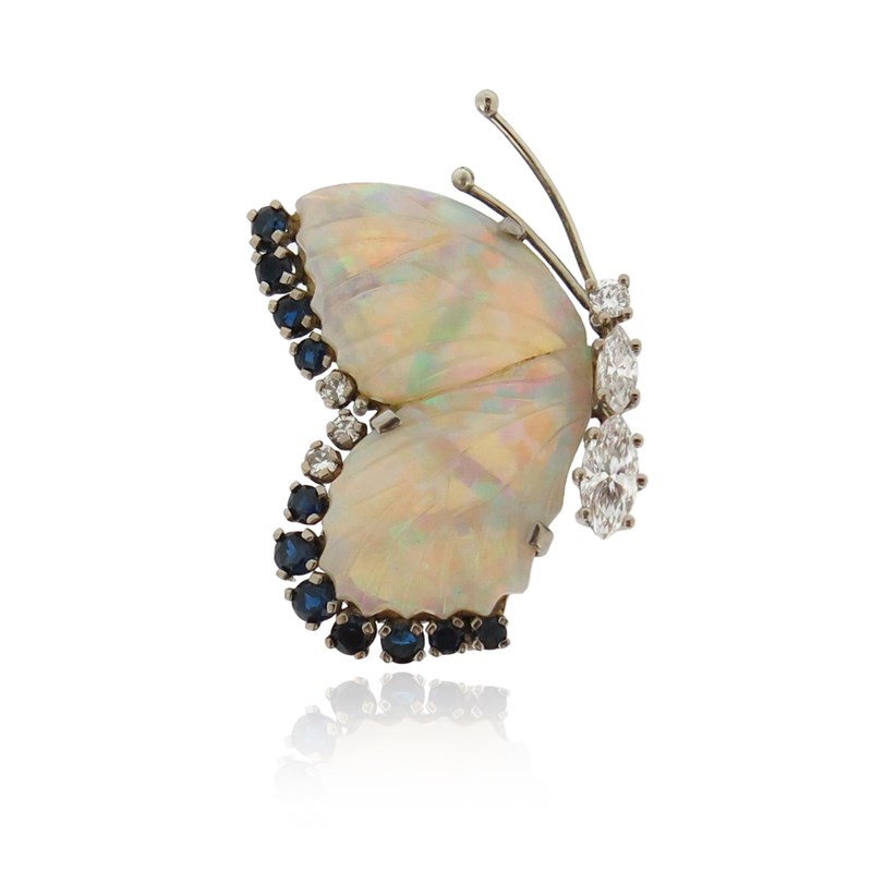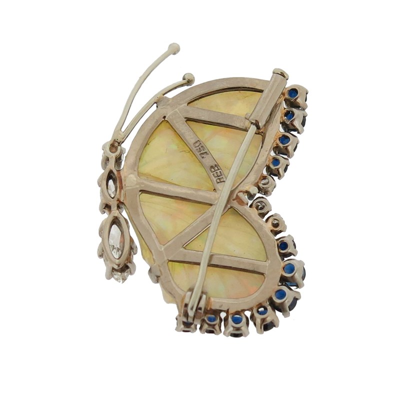A gem-set gold butterfly brooch, the wings formed from carved white opal with sapphire and diamond tips, the body set with diamonds in white gold, 3cm high