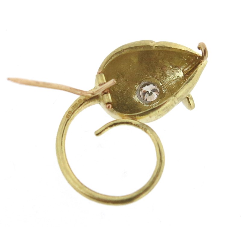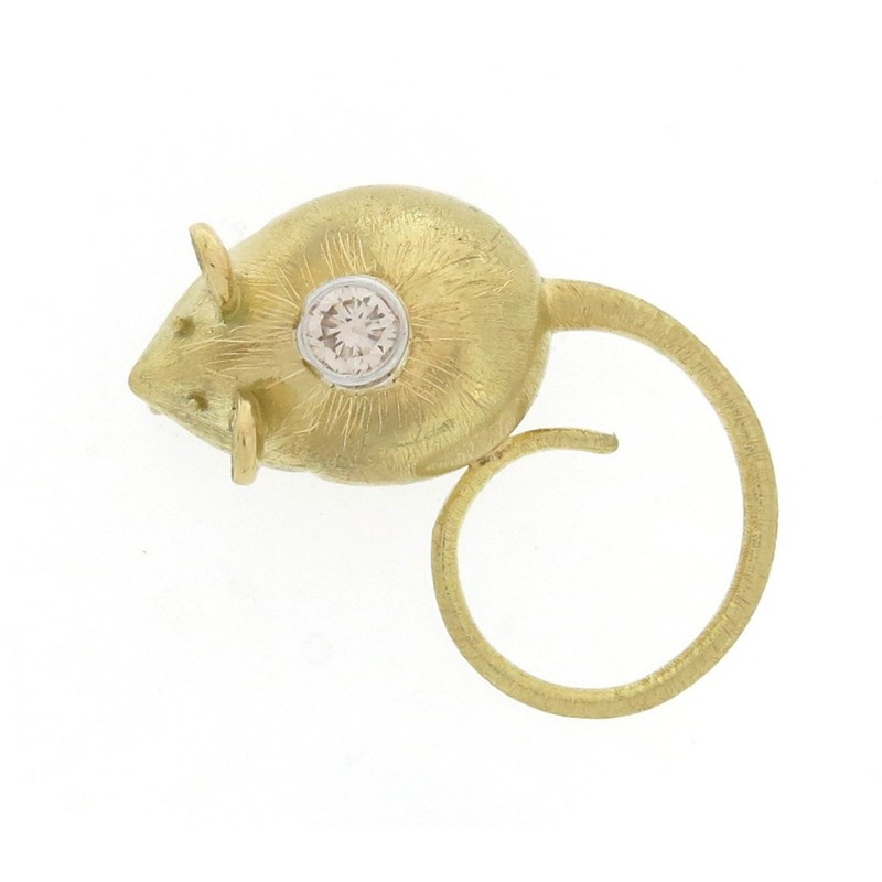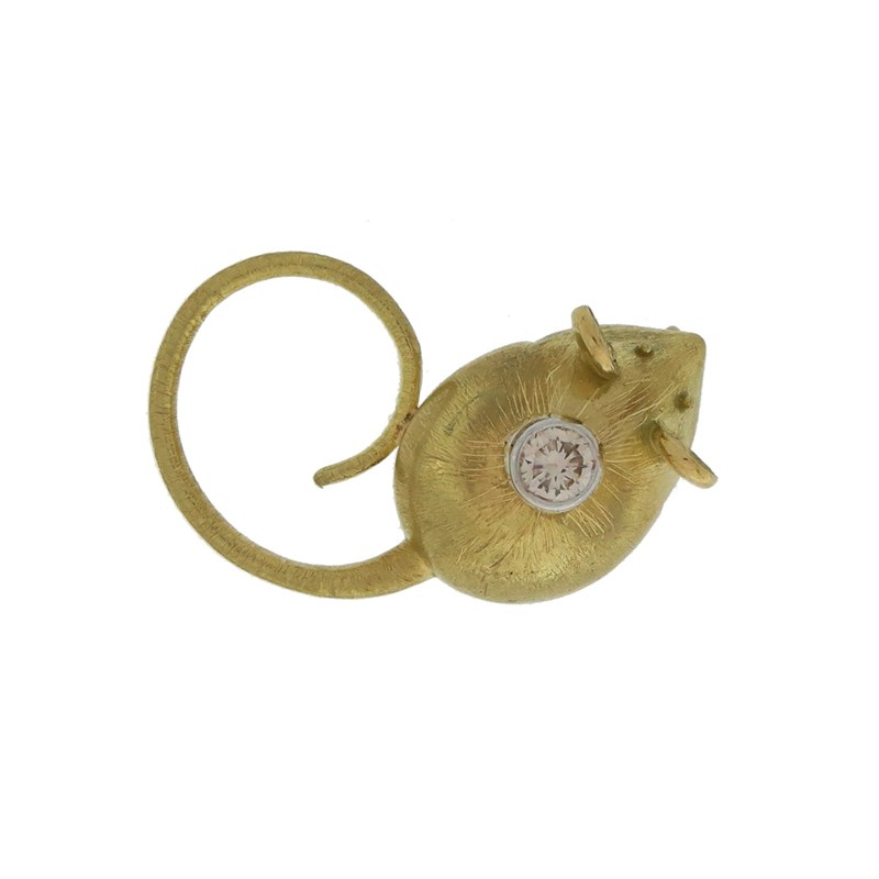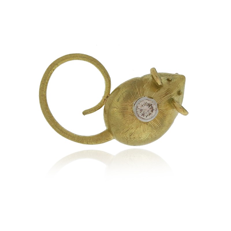 A diamond-set gold mouse brooch by Leo de Vroomen, rubover-set with a round brilliant-cut diamond within textured yellow gold, with maker's mark LDV and 18ct London hallmarks for 1982, 3.2cm wide