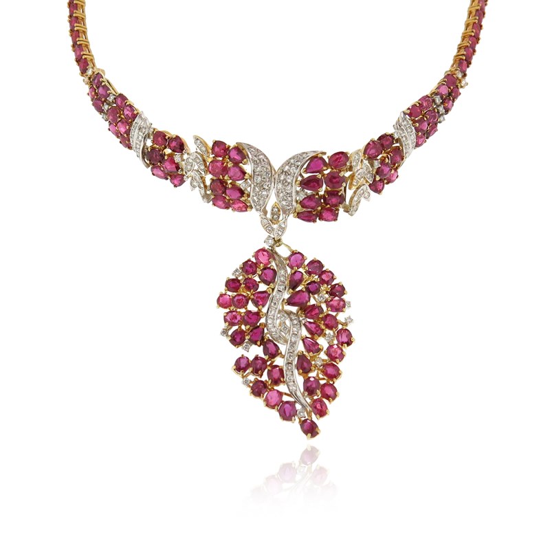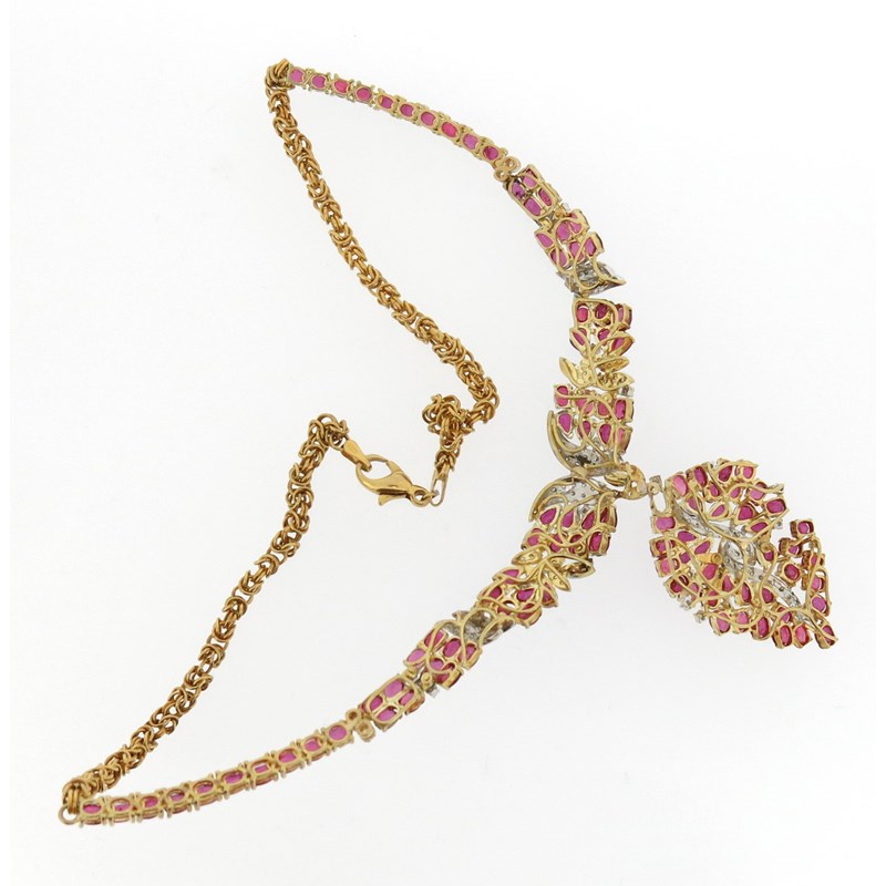 A ruby and diamond-set gold necklace, alternately-set with rubies and diamonds, suspending a leaf-shaped articulated pendant set overall with pear-shaped rubies and a zig zag of graduated circular-cut diamonds in platinum and gold, with a fancy-link yellow gold back chain, 44cm long