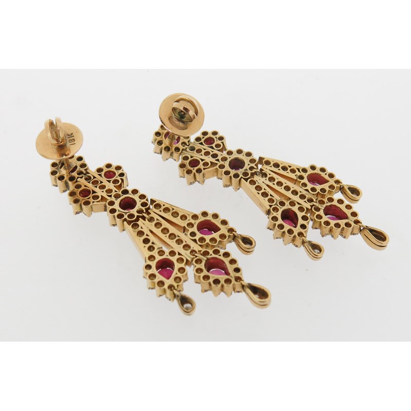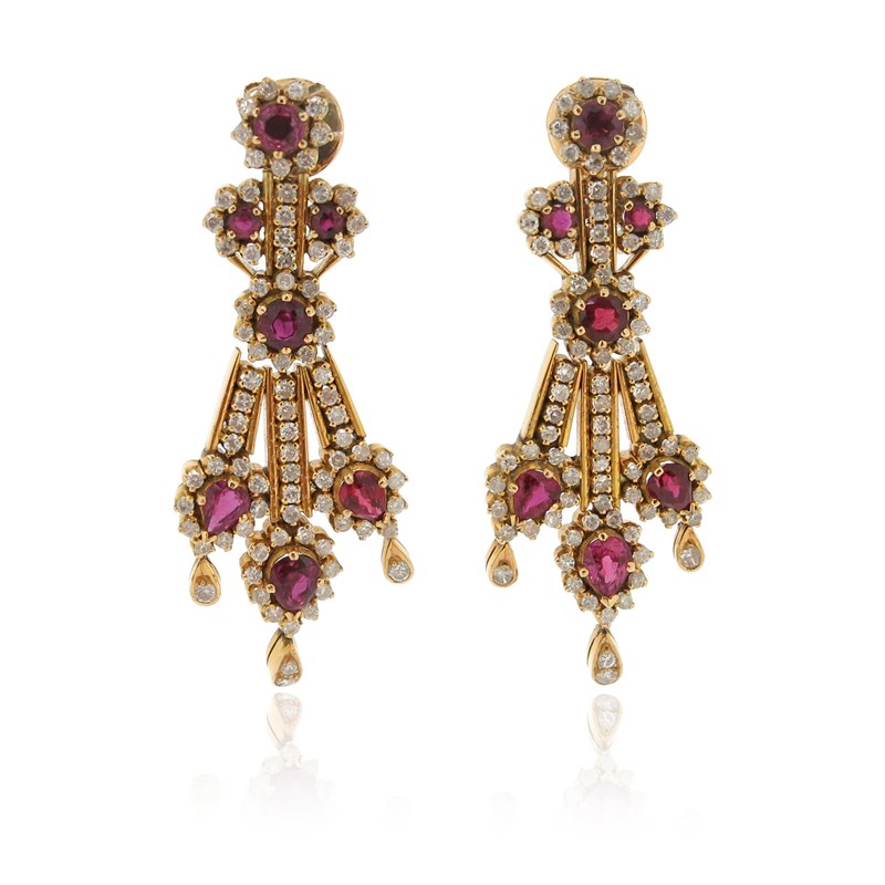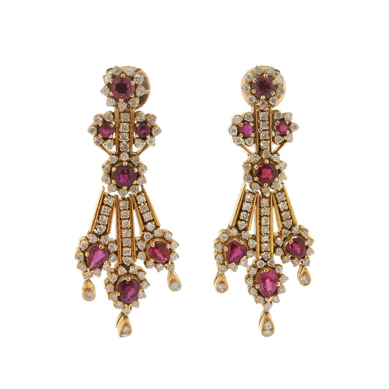 A pair of ruby and diamond drop earrings, set with ruby and diamond clusters suspended on lines of round brilliant-cut diamonds in yellow gold, post fittings, 5.2cm high