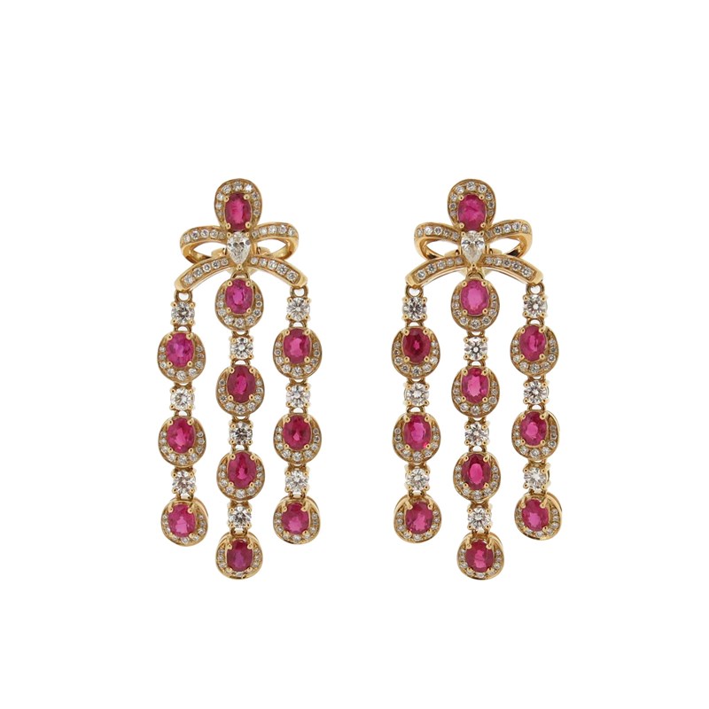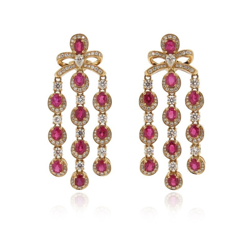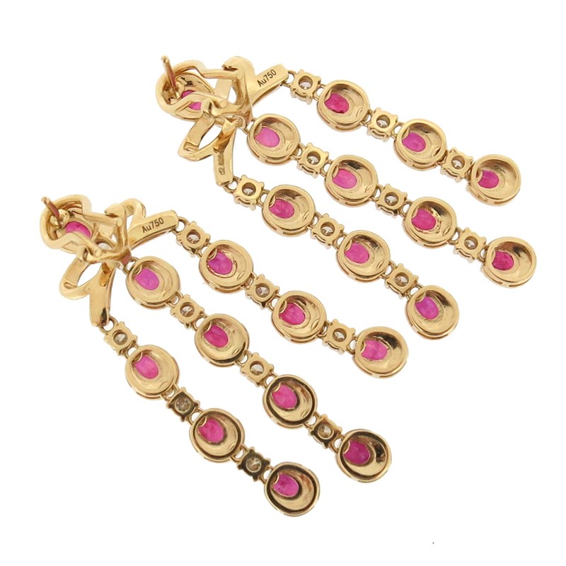 A pair of ruby and diamond-set gold drop earrings, with bow-form upper sections, each suspending three articulated pendants, set with oval-shaped rubies, round brilliant-cut diamonds and a pear-shaped diamond in yellow gold, post and clip fittings, 4.8cm high