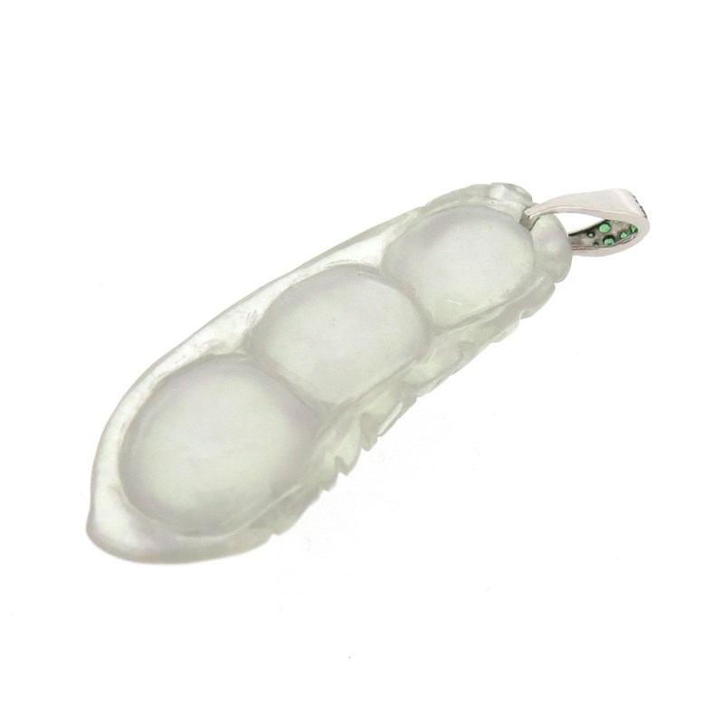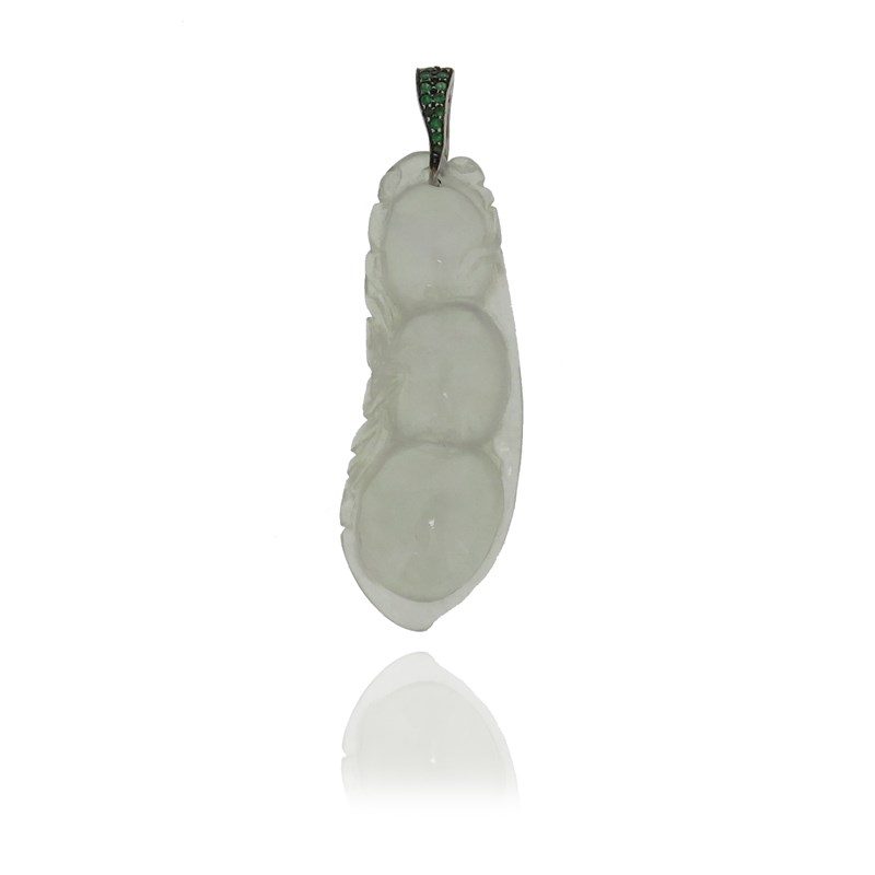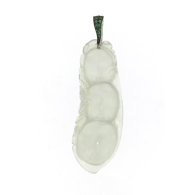 A carved jade pea pod pendant, with a tsavorite garnet-set platinum bale, 6.2cm high