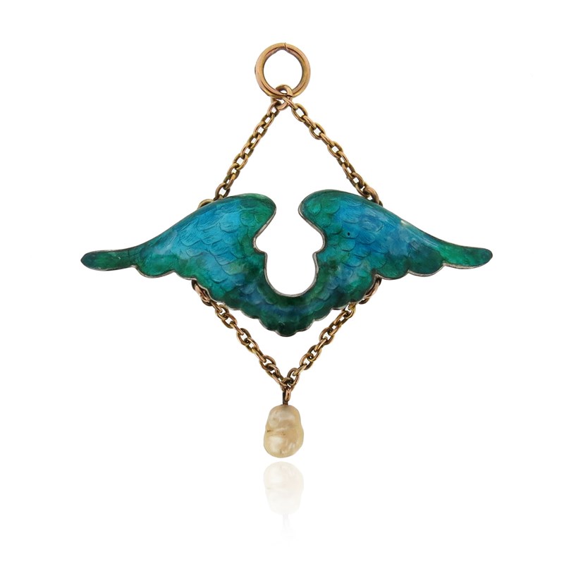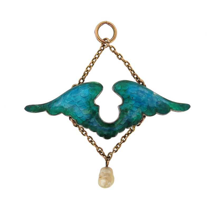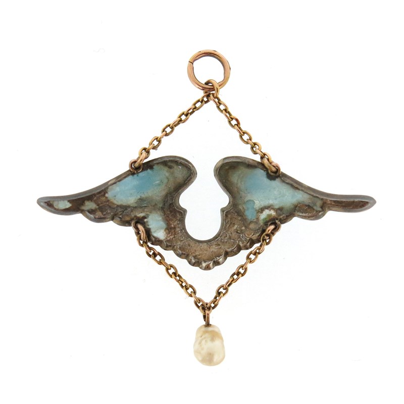 An enamel wings pendant by Child & Child, the stylised wings decorated with green and blue enamel on fine-link gold chain suspending a pearl, maker's mark to reverse (covered with enamel) and counter enamel in blue (damaged) 5.5cm wide