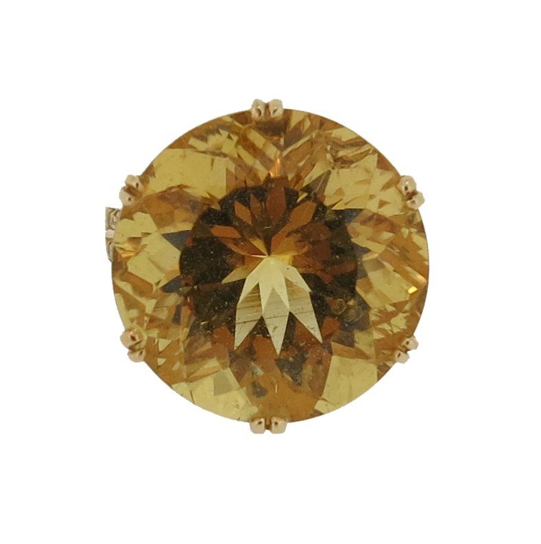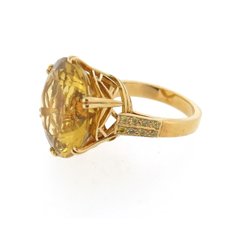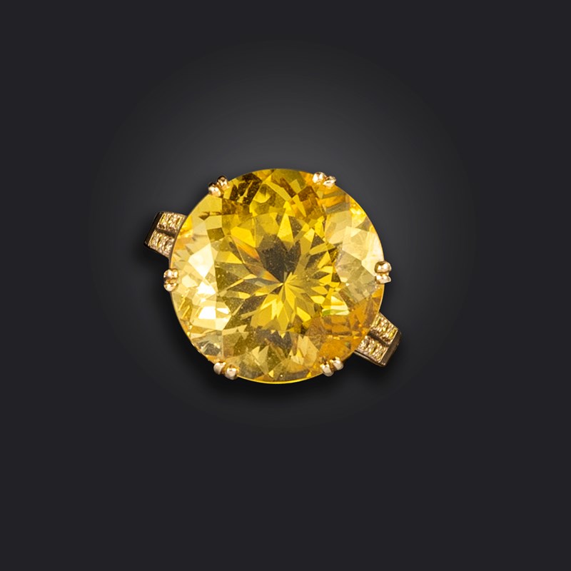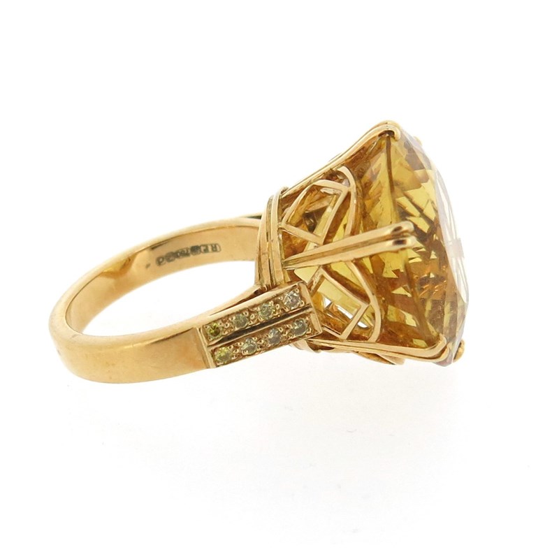 A heliodor-mounted gold ring by Geoffrey Rowlandson, the circular-cut yellow beryl set in 18ct yellow gold with eight yellow round brilliant-cut diamonds to each shoulder, London marks for 2003, size N
