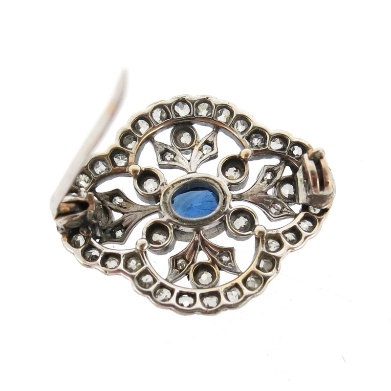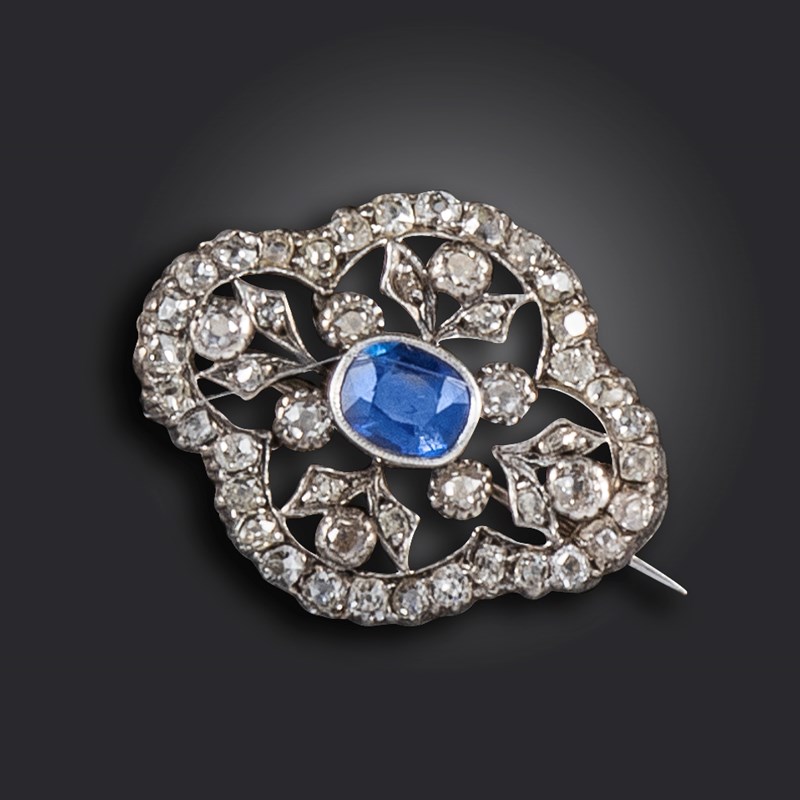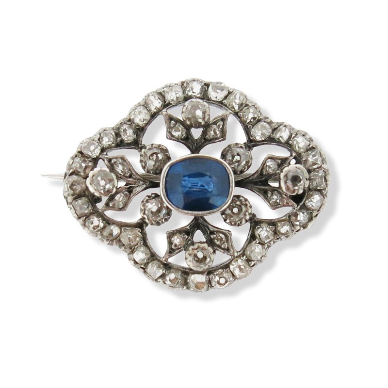 A Victorian sapphire and diamond quatrefoil brooch, the oval-shaped sapphire is set within foliate surround of graduated old cushion-shaped diamonds in silver and gold, 2.5cm wide