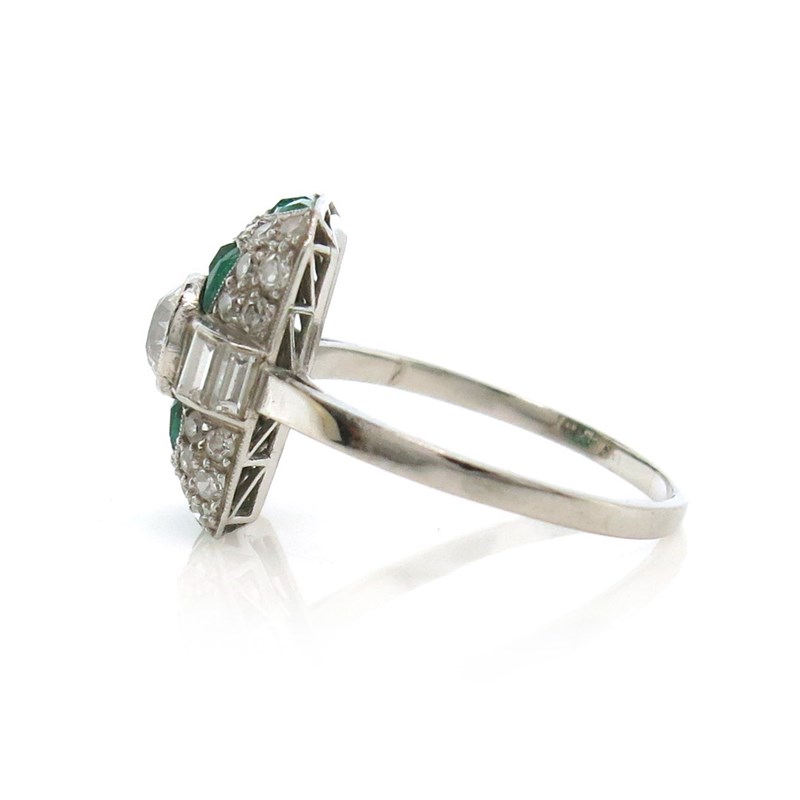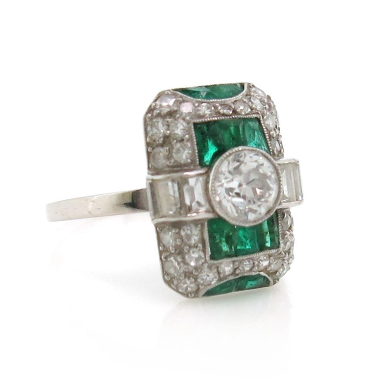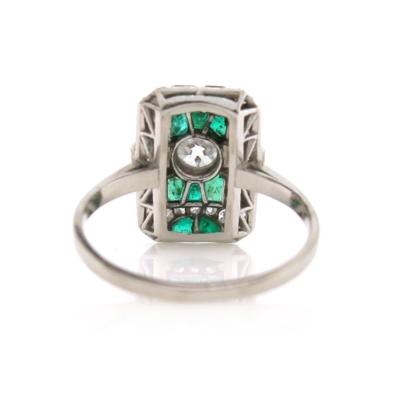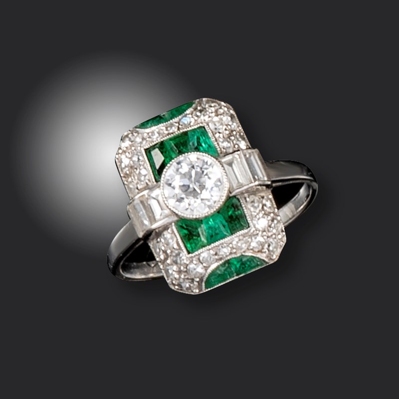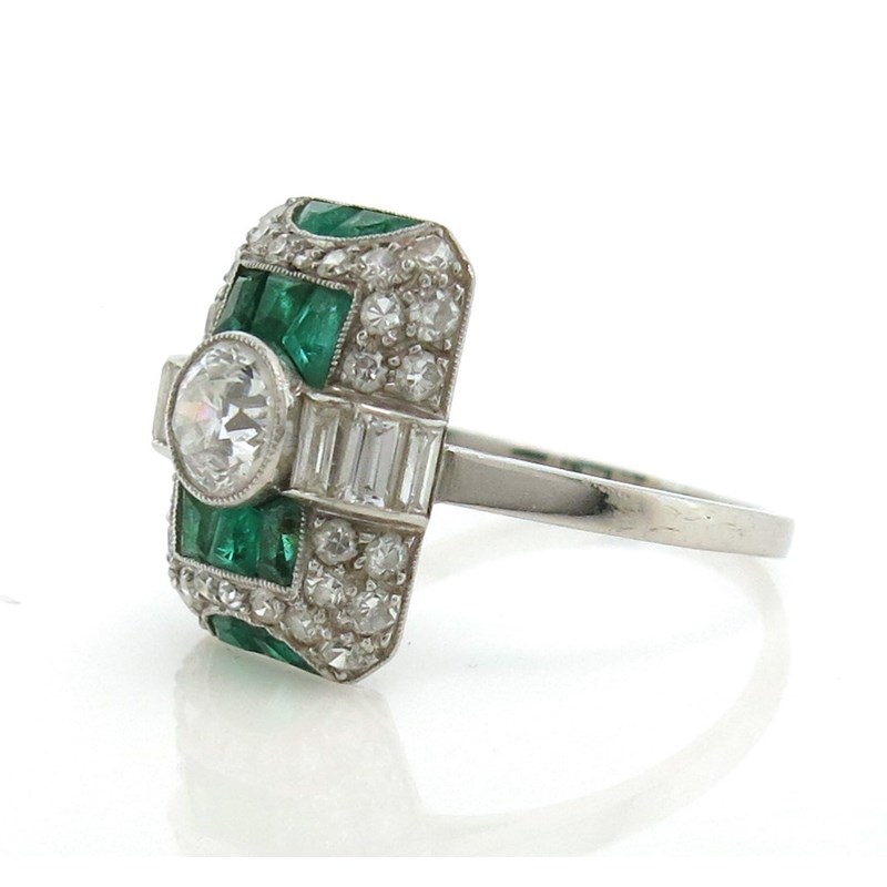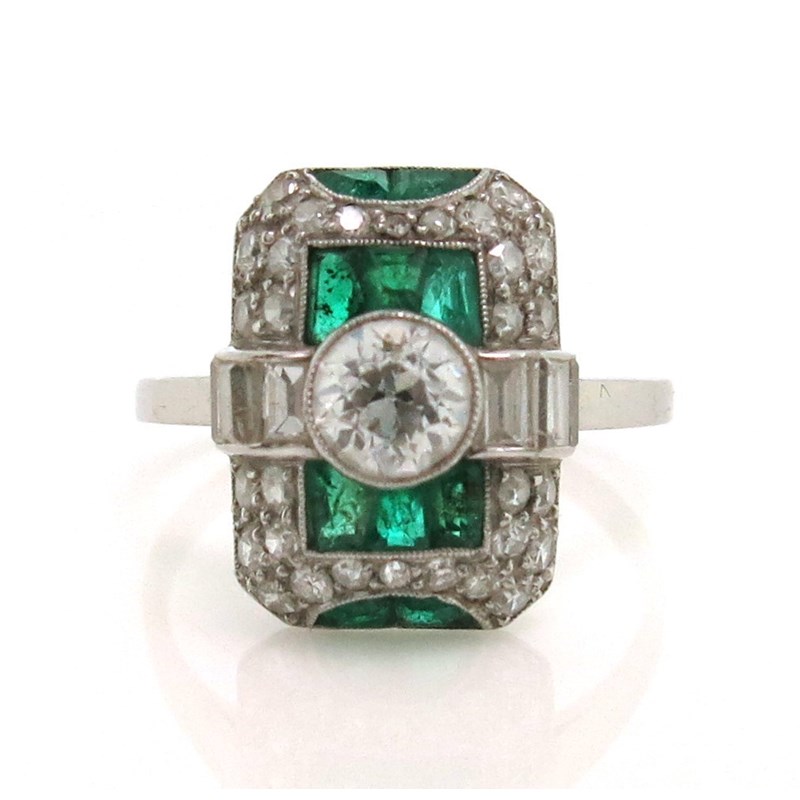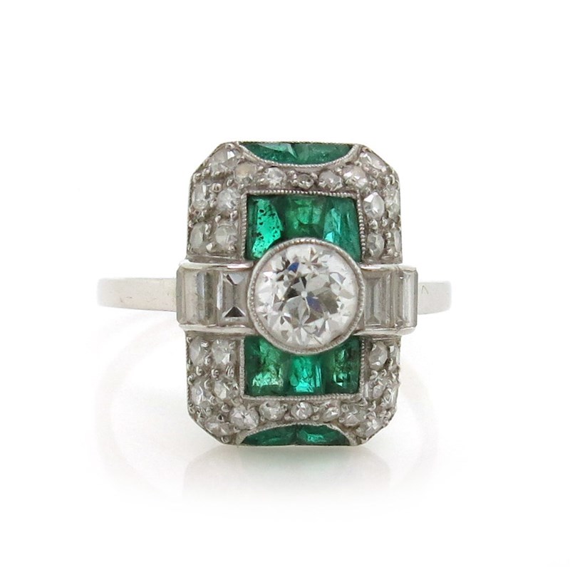 An Art Deco emerald and diamond ring, set with an old circular-cut diamond flanked with baguette-shaped diamonds within emerald and diamond rectangular surround, set in platinum, size O