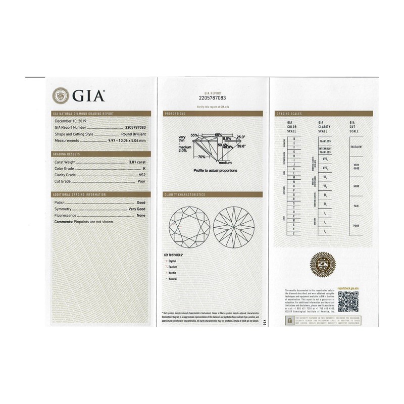 Accompanied by report number 2205787083 dated 10 December 2019 from GIA stating that the round brilliant-cut diamond weighs 3.01cts and is a natural diamond with K colour and VS2 clarity. Fluorescence: nil