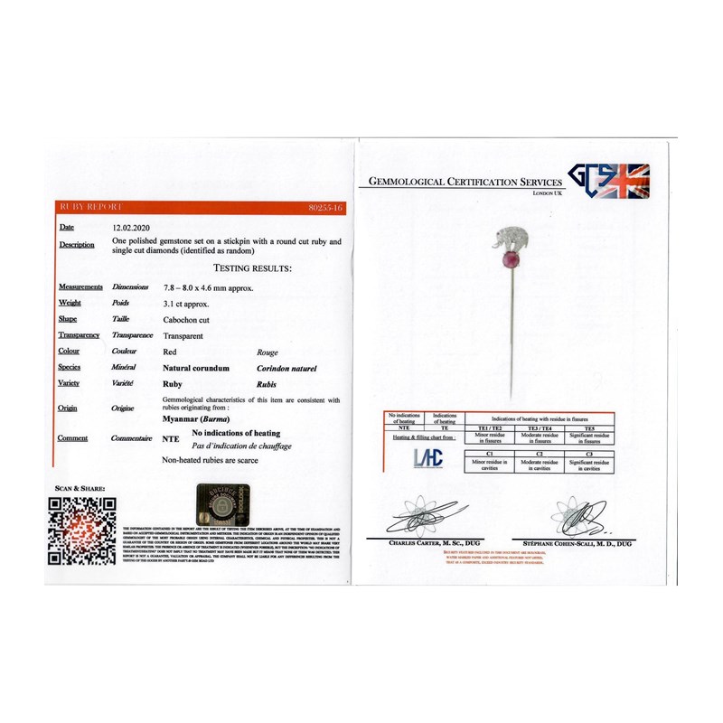 Accompanied by report number 80255-16 dated 12 February 2020 from GCS stating that the cabochon-cut ruby weighs 3.10cts approximately and is a natural ruby with no indications of heat treatment. Origin: Burma (Myanmar)
