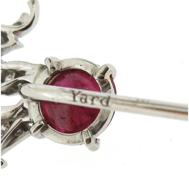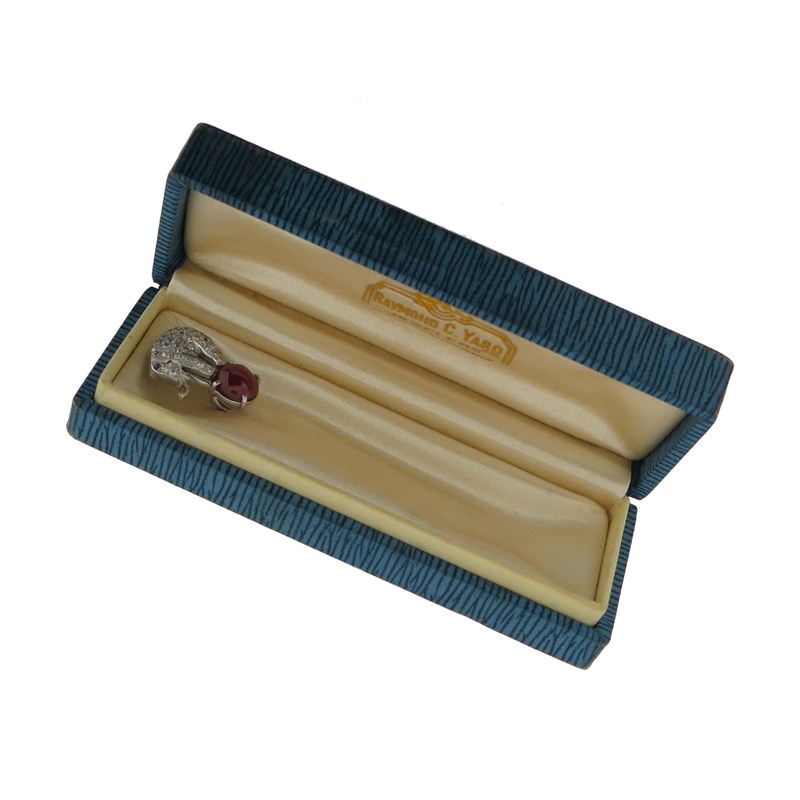 An Art Deco ruby and diamond elephant stickpin by Raymond Yard, the circus elephant pave-set with diamonds, balancing on a cabochon ruby ball, set in platinum, sign YARD, 8.2cm high, 17mm wide, Raymond Yard case