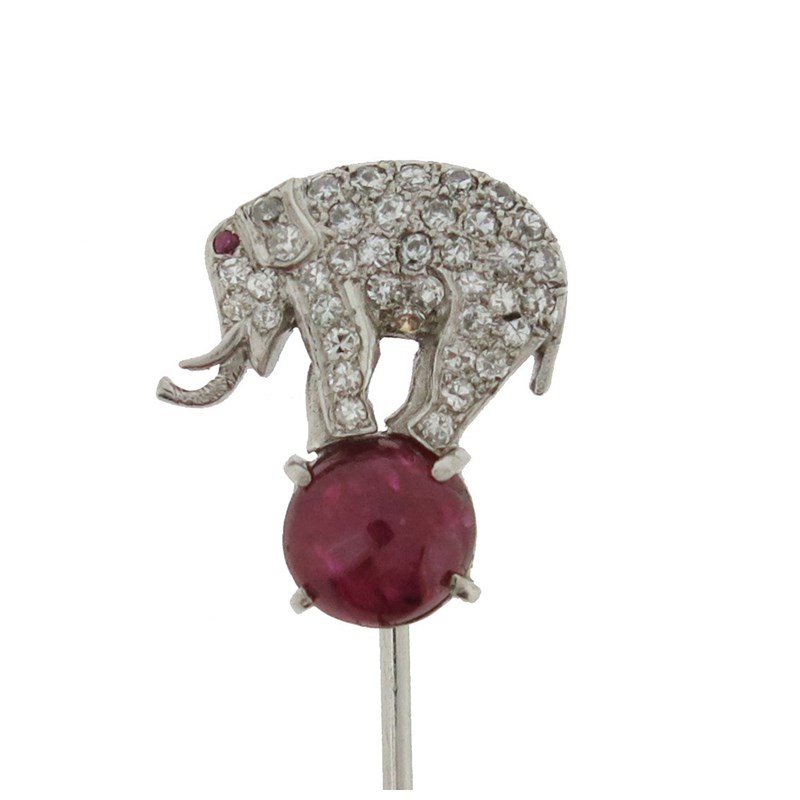 An Art Deco ruby and diamond elephant stickpin by Raymond Yard