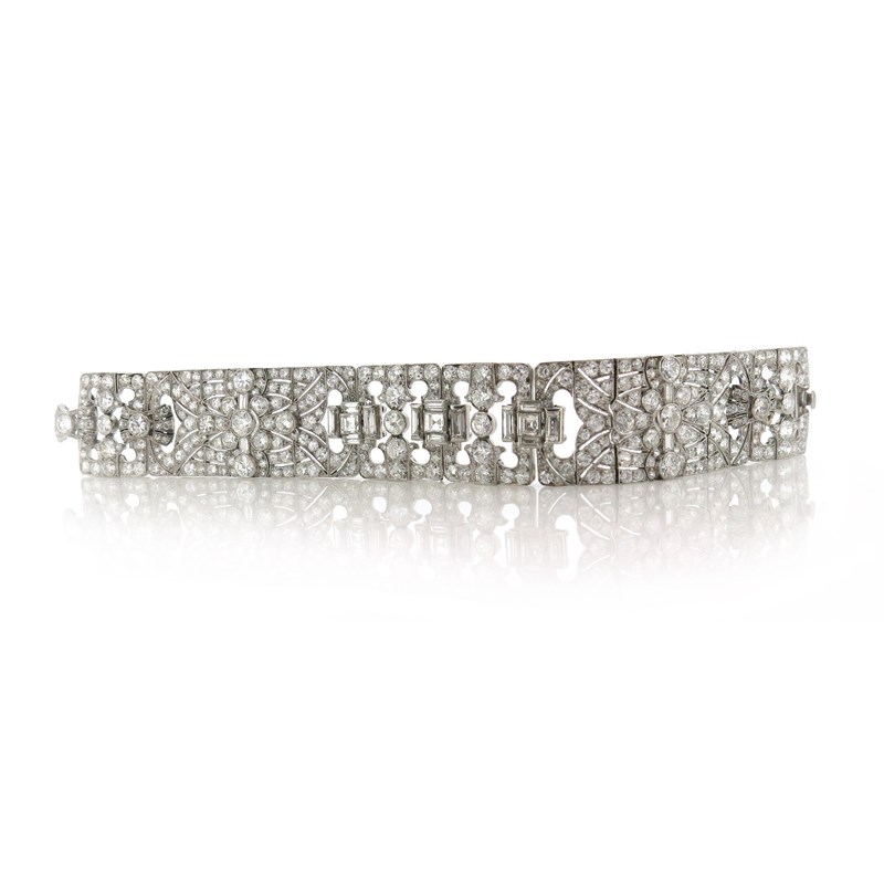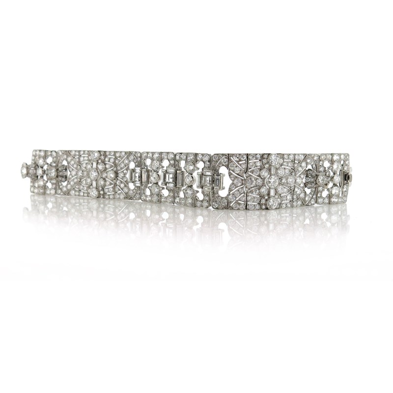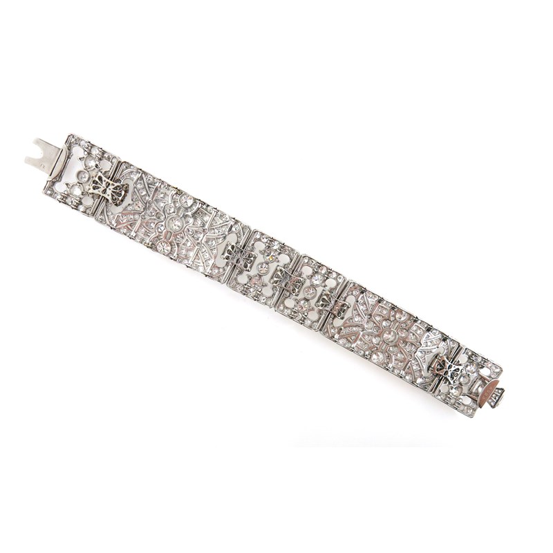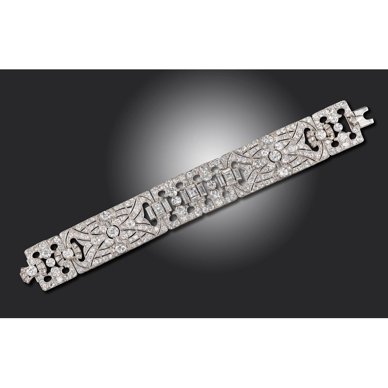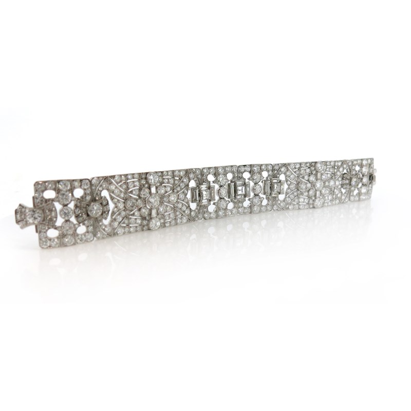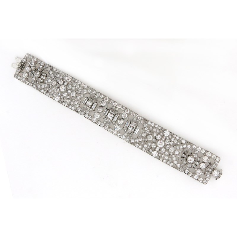 An Art Deco diamond bracelet by S.J.Rood, set with graduated square and baguette-shaped diamonds in pierced abstract motif millegrain-set with circular-cut diamonds in platinum, signed ROOD, 2.7cm wide, 17.5cm long