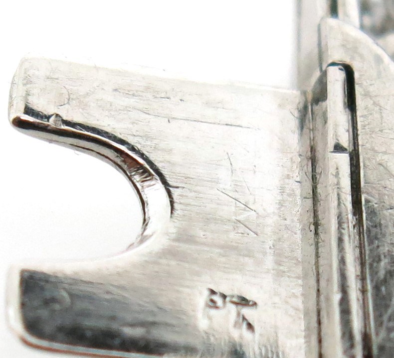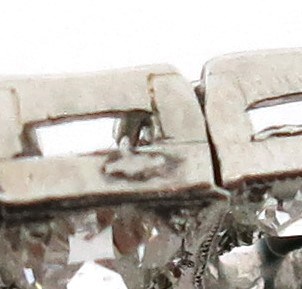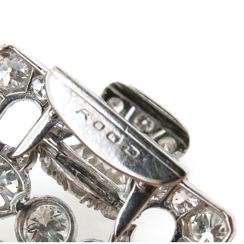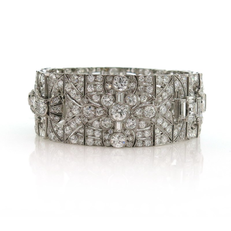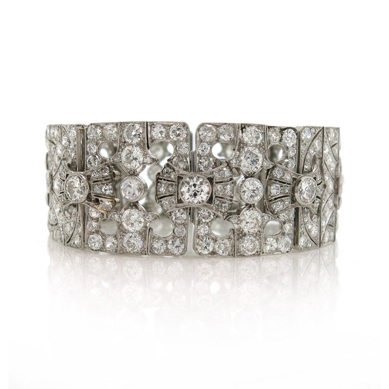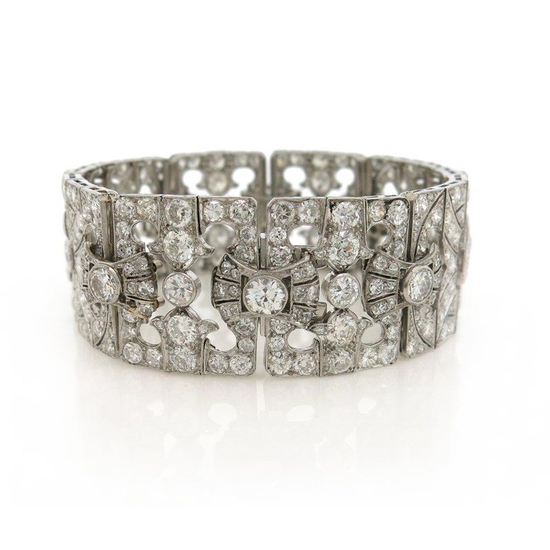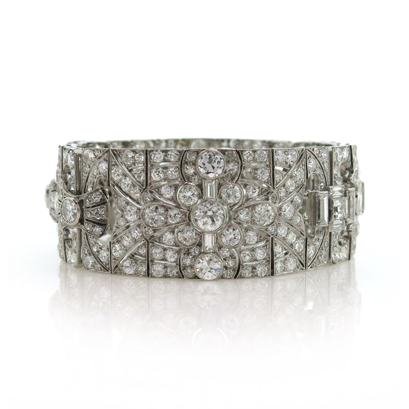 An Art Deco diamond bracelet by S.J.Rood, set with graduated square and baguette-shaped diamonds in pierced abstract motif millegrain-set with circular-cut diamonds in platinum, signed ROOD, 2.7cm wide, 17.5cm long
