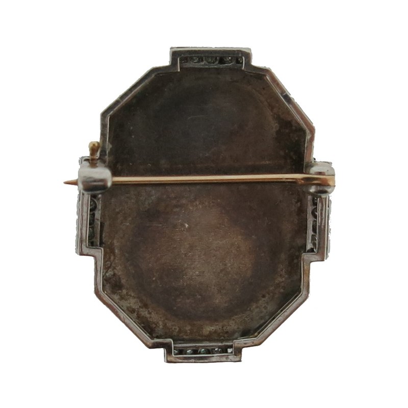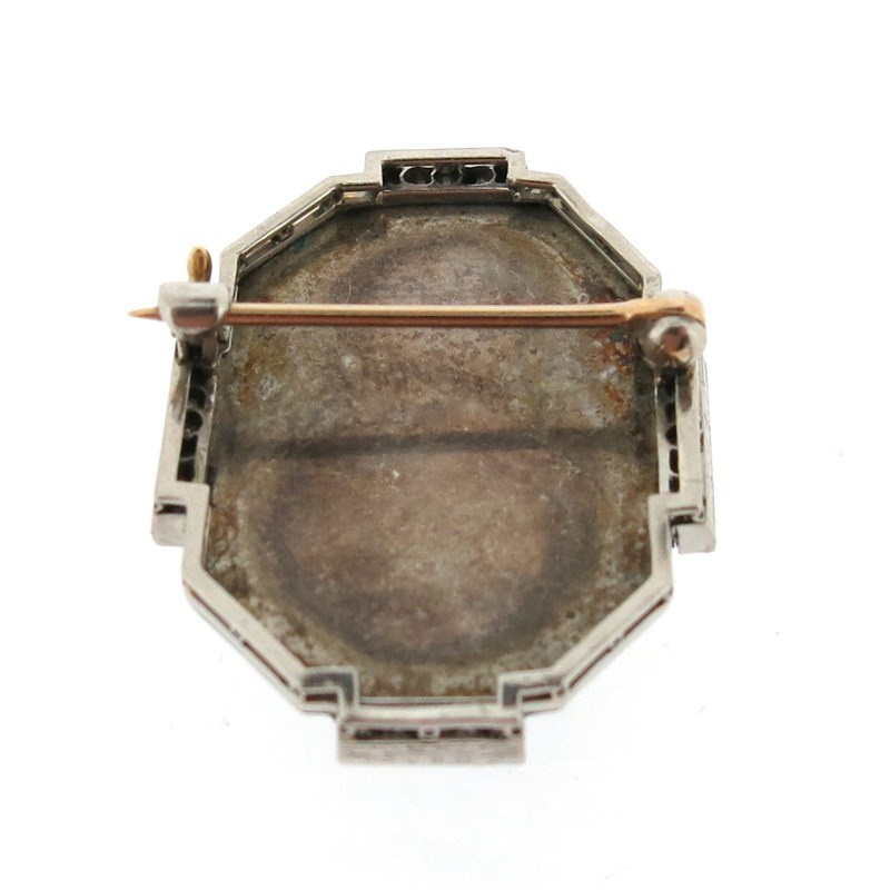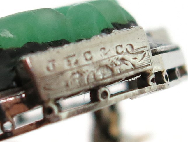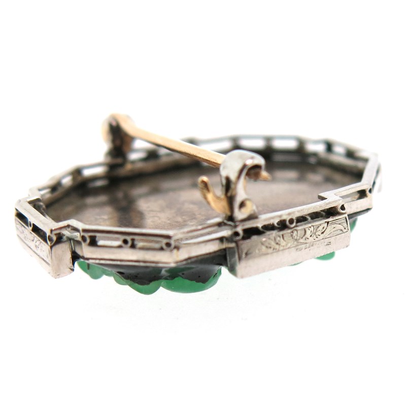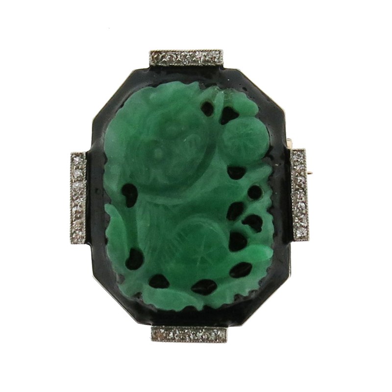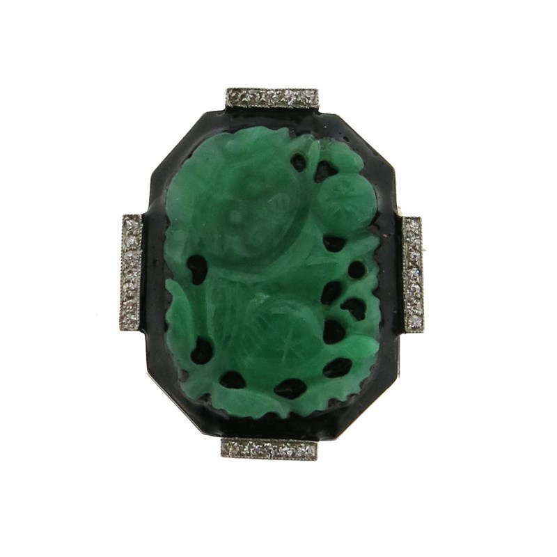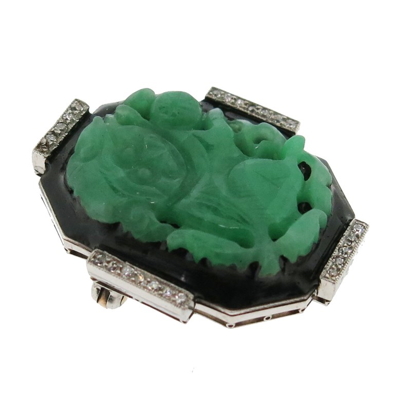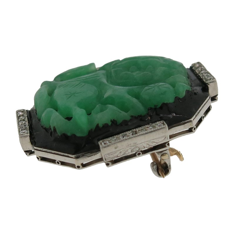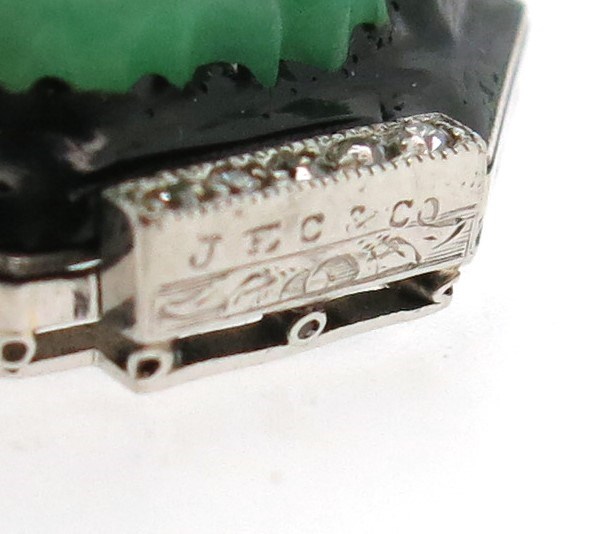 An Art Deco jade, enamel and diamond plaque brooch by J E Caldwell, the jade carved as a fabulous animal on black enamel ground quartered with diamond panels, in octagonal platinum and gold mount, signed JEC & Co, 3cm high, case by J. E. Caldwell & Co