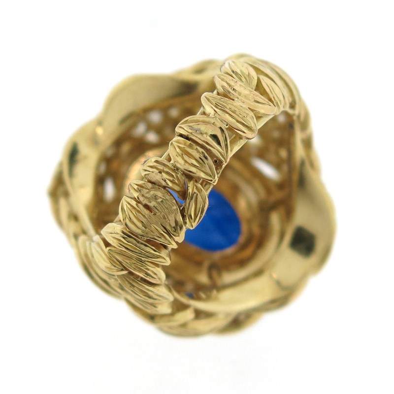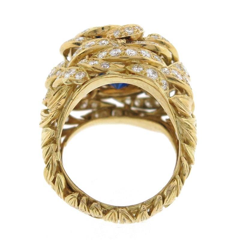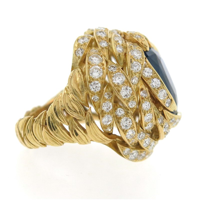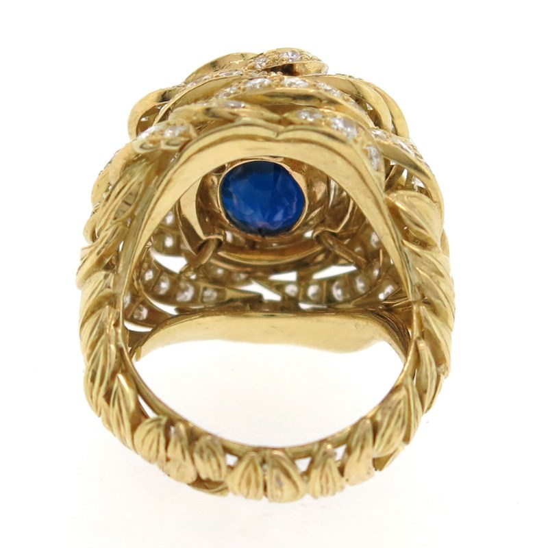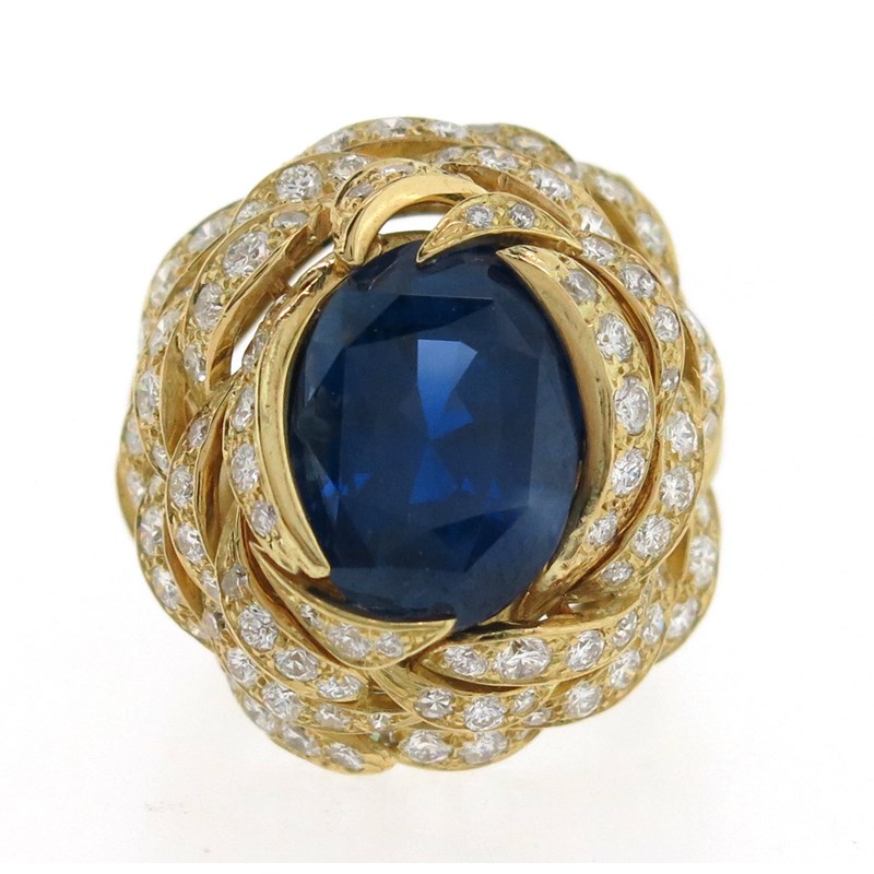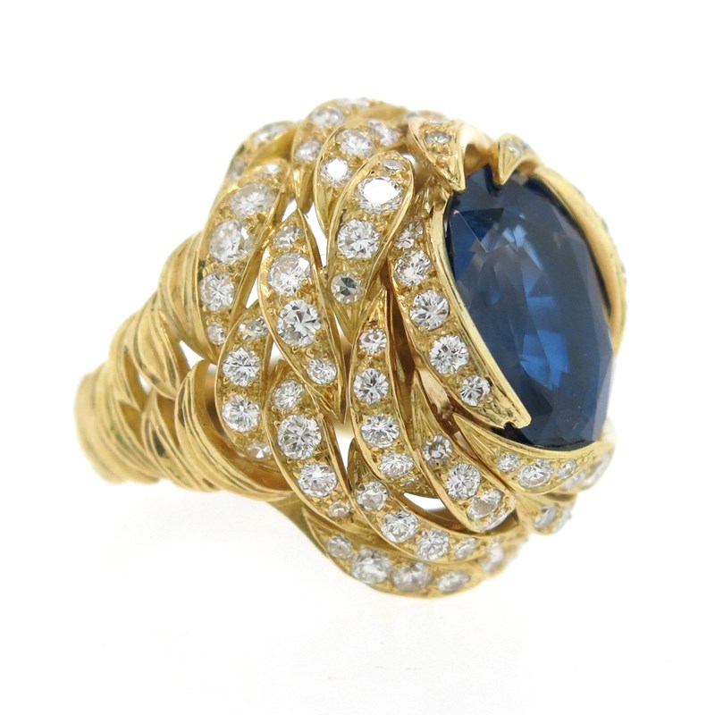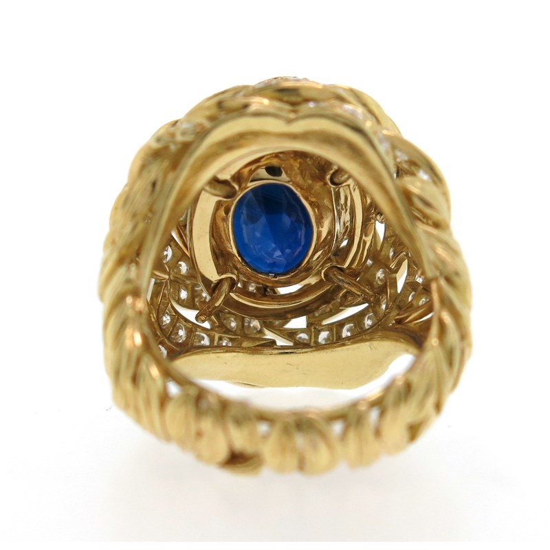 ‡ A sapphire and diamond-set yellow gold ring by Andrew Grima, designed as a birds nest, set with an oval-shaped sapphire weighing approximately 8.50cts and graduated circular-cut diamonds with conforming decoration to the shank, signed GRIMA, obscure makers mark ending 'HJ Co', London marks for 1966, size J 1/2