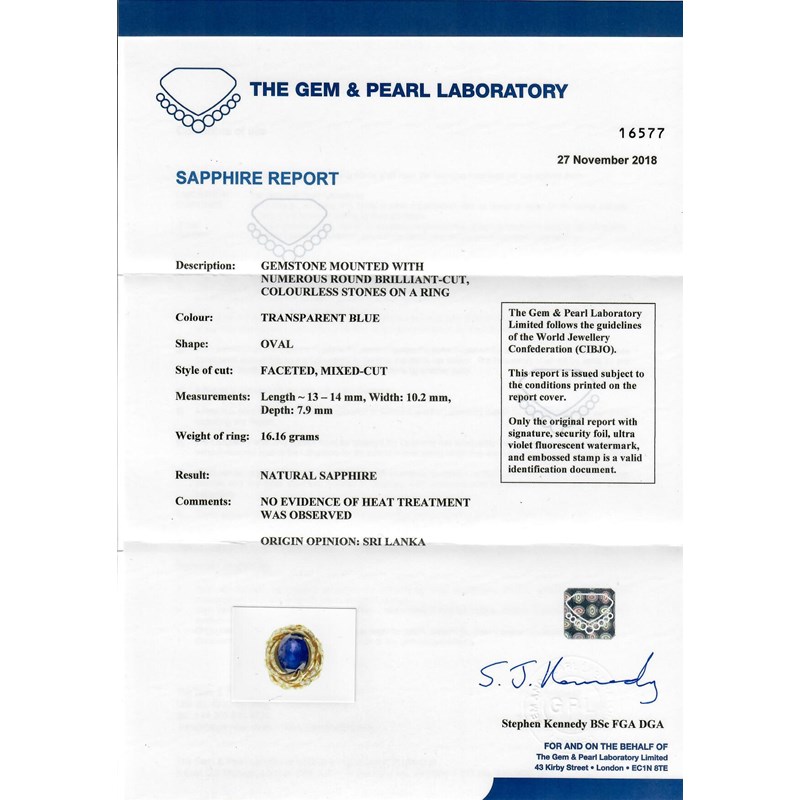 Accompanied by report number 16577 dated 27 November 2018 from The Gem & Pearl Lab stating that the oval-shaped sapphire measures 13-14mm x 10.2mm x 7.9mm approximately and is a natural sapphire with no indications of heat treatment. Origin: Sri Lanka (Ceylon)
