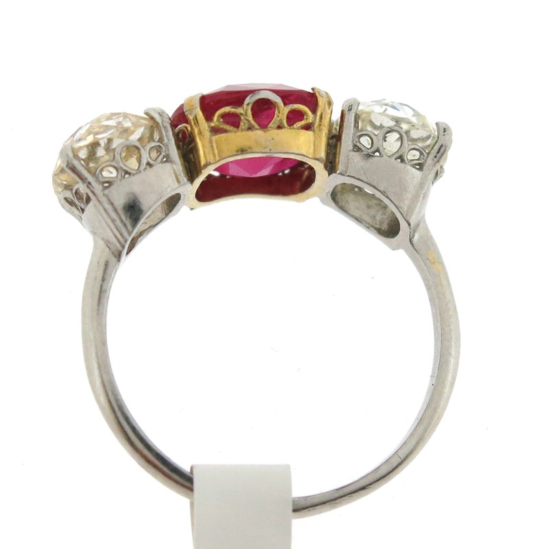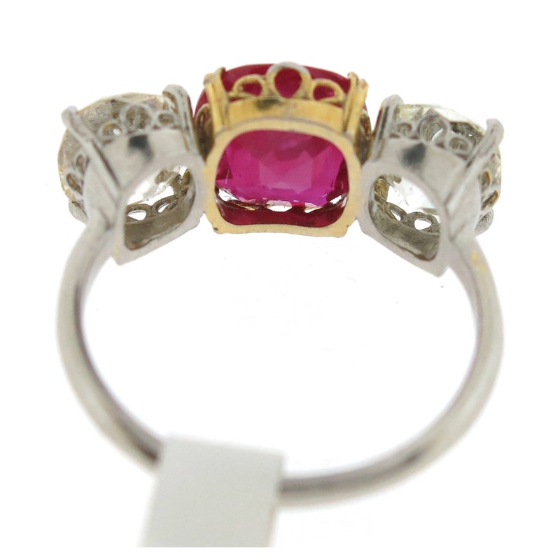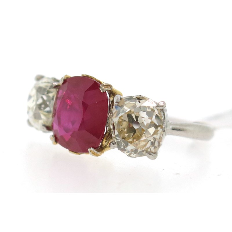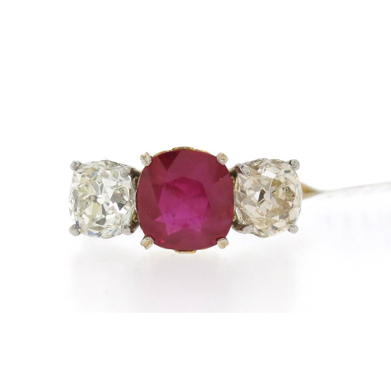 A ruby and diamond three-stone ring, the cushion-shaped ruby weighs 3.14cts, set with two cushion-shaped shoulder diamonds in yellow gold and platinum, size ;