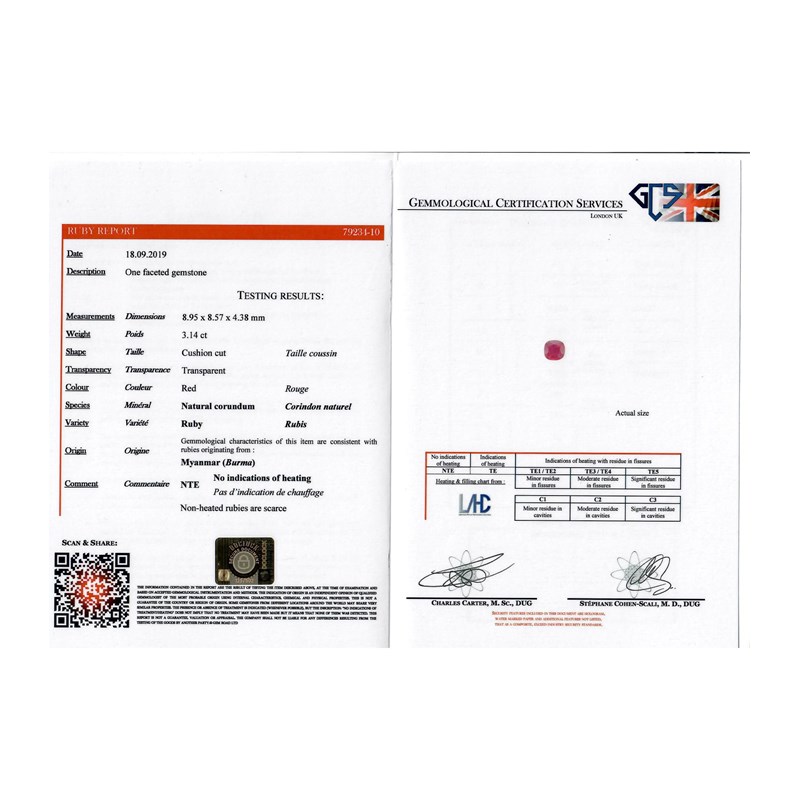 Accompanied by report number 79234-10 dated 18 September 2019 from GCS stating that the cushion-cut ruby weighs 3.14cts and is a natural ruby with no indications of heat treatment. Origin: Burma (Myanmar)
