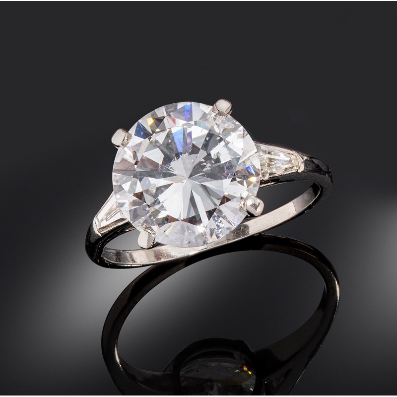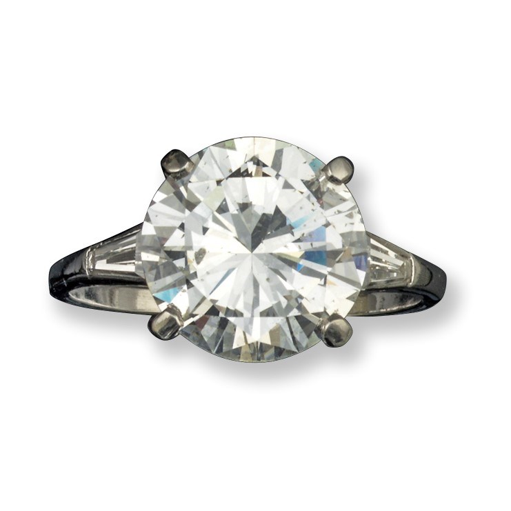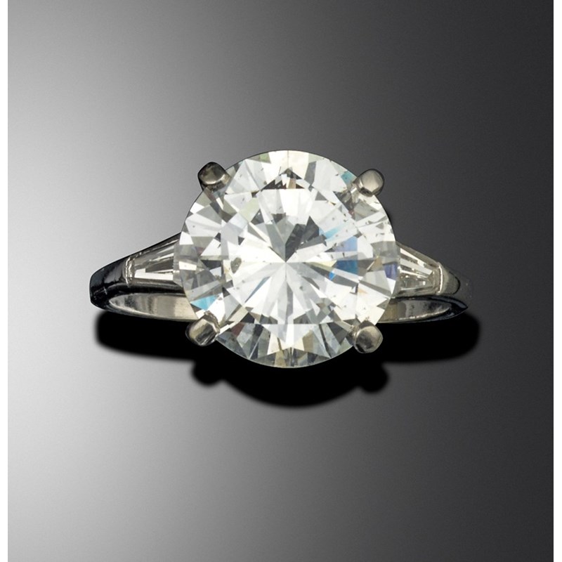 A diamond solitaire ring, the round brilliant-cut diamond weighs 5.23cts, set with two tapered baguette-shapes shoulder diamonds in platinum, size P 1/2