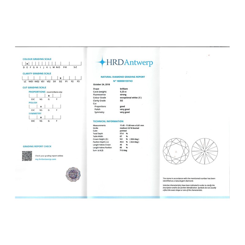 Accompanied by report number 180000159743 dated 24 October 2018 from HRD stating that the brilliant-cut diamond weighs 5.23cts and is a natural diamond with E colour and SI2 clarity. Fluorescence: strong