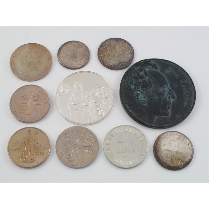 Nine assorted coins and medallions. And a Jean Cocteau 1951 bronze medallion.