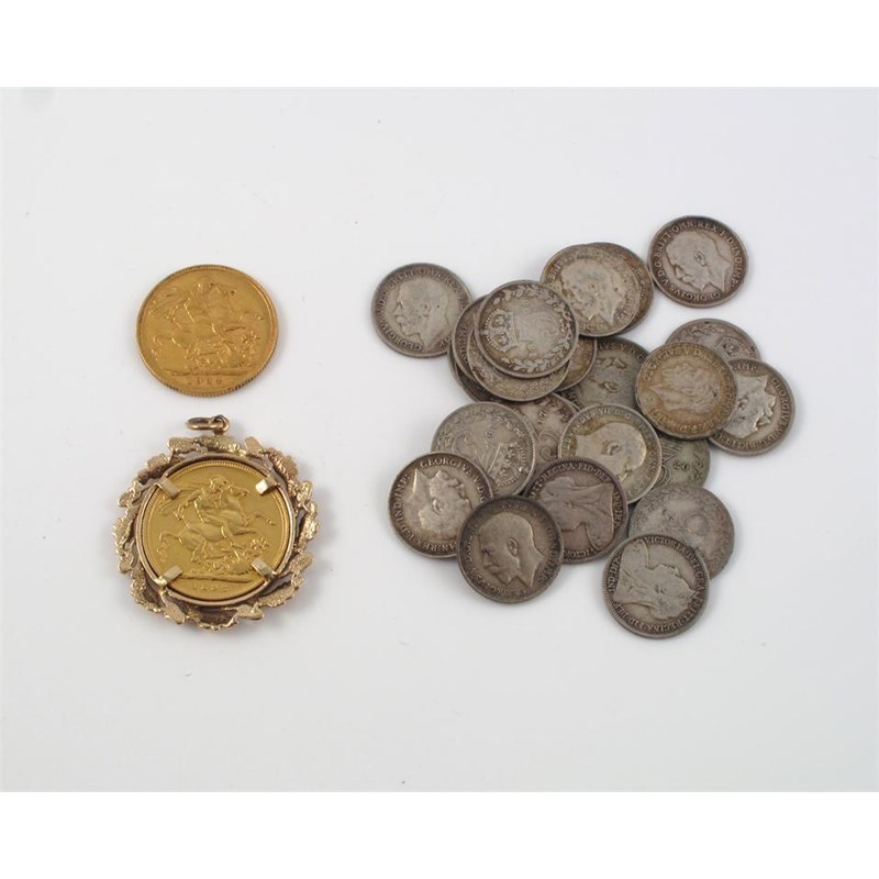 A gold mounted sovereign pendant, 1892. A sovereign, Sydney 1904. And twenty six three pence silver coins.