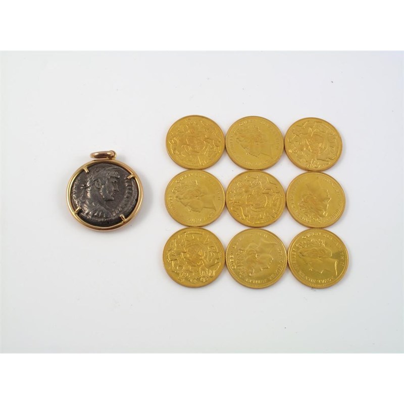 Nine 9ct gold commemorative medallions, 5.1g each. And a gold mounted ancient coin pendant.