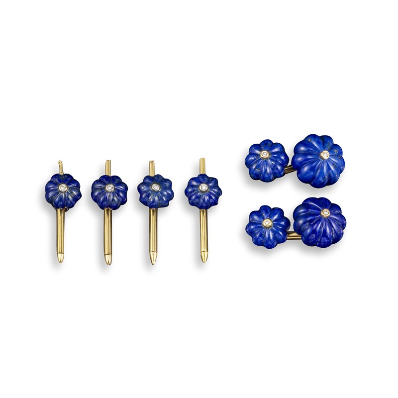 A lapis lazuli and diamond dress set, comprising cufflinks and four buttons, the fluted lapis lazuli beads each set with a diamond in yellow gold