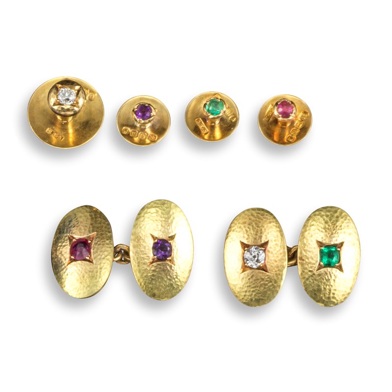 A pair of early 20th century gem-set acrostic gold cufflinks, the oval-shaped hammered gold links set with a circular-cut diamond, emerald, amethyst and ruby spelling 'DEAR', maker's mark CS*FS and with 18ct Chester hallmarks for 1907, each link 1.9cm high, with a conforming set of studs, maker's mark S.BS and 18ct London hallmarks for 1907, fitted case