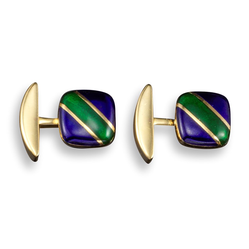 A pair of enamel and gold cufflinks, with blue and green striped enamel decoration in yellow gold, with Italian hallmarks and stamped 750, each 1.3cm wide