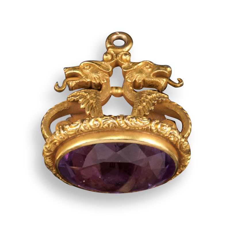 A Regency amethyst-set gold fob seal, the scrolling mount designed with the busts of two dragons, with further foliate decoration and set with an oval-shaped amethyst in yellow gold, 2.8cm high