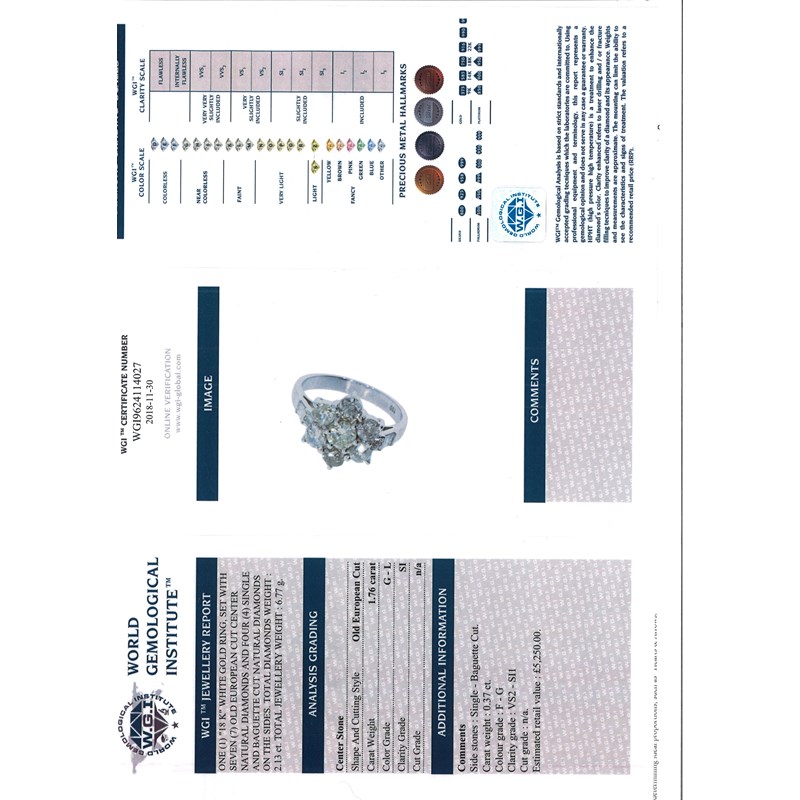 Accompanied by report number WGI9624114027 dated 30 November 2018 from WGI, stating that the old European-cut diamond weighs 1.76cts, is G-L colour and has SI clarity.