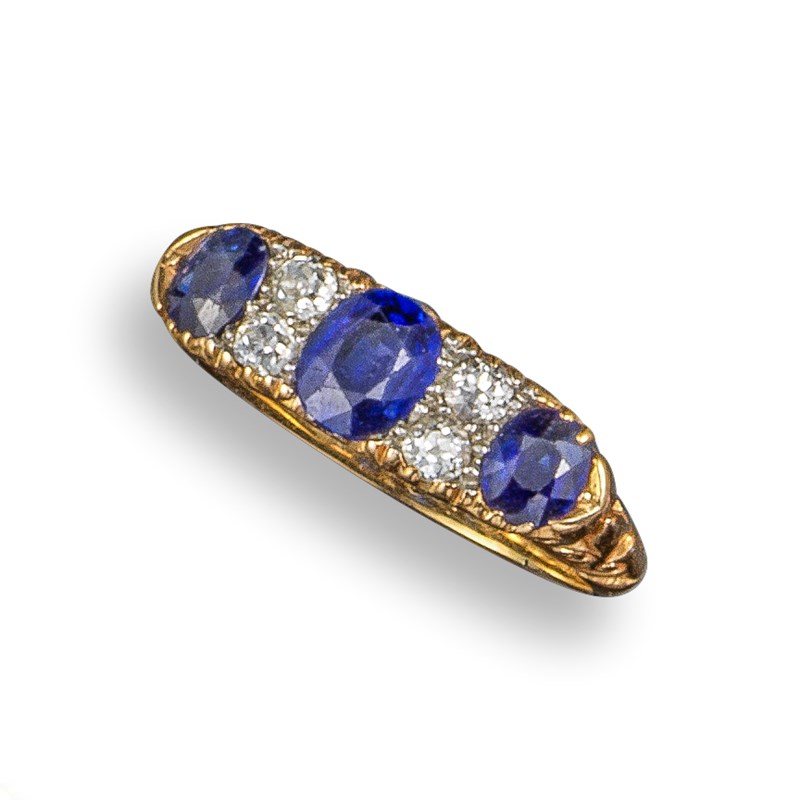 A sapphire and diamond half-hoop ring, set with three graduated oval-shaped sapphires separated with pairs of diamonds in gold, size M