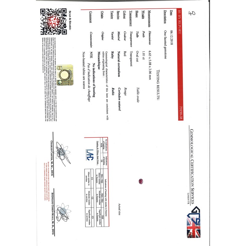 Accompanied by report number 79190-58 dated 6 December 2018 from GCS, London stating that the oval-cut ruby weighs 1.01cts and is a natural ruby with no indications of heat treatment. Origin: Mozambique