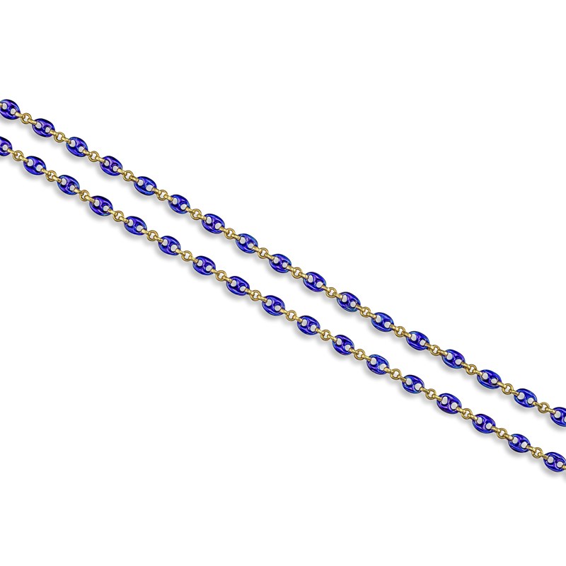 An anchor-link gold and enamel necklace, the anchor links alternately decorated with blue enamel, French import mark, tongue clasp with safety catch, 88cm long