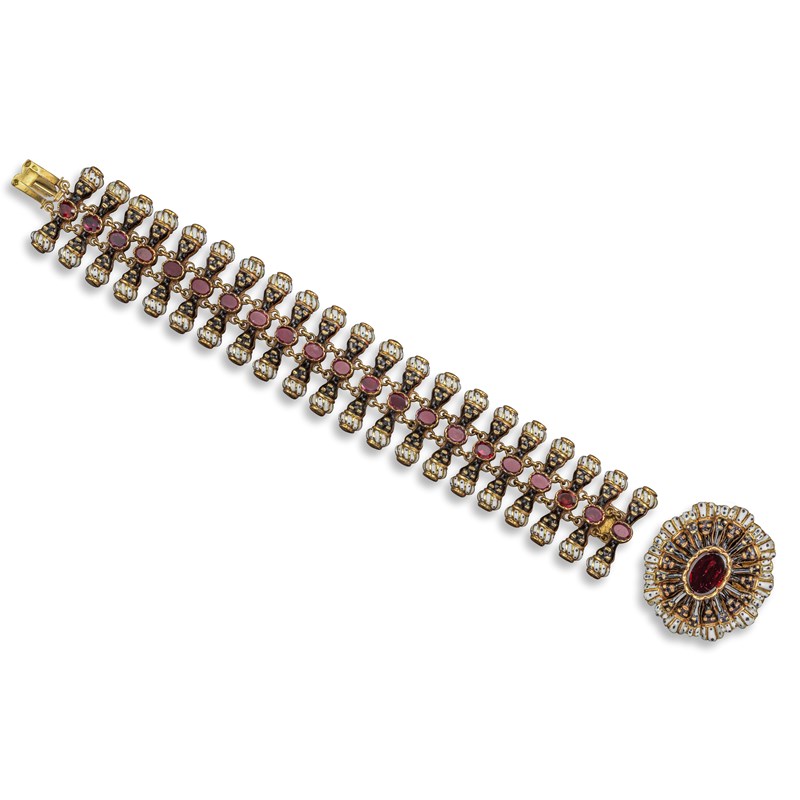 A garnet-set gold bracelet, each link mounted with a blackamoor's head decorated with black and white enamel in yellow gold, Austrian marks, 17cm long, with matching oval-shaped brooch, 3.5cm high