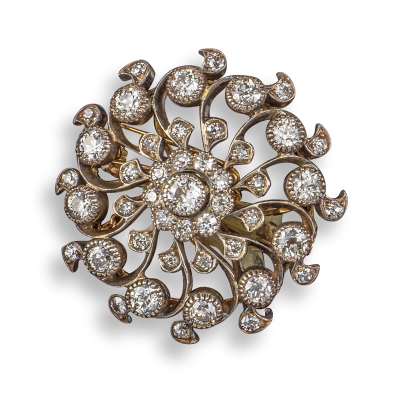 A Victorian diamond scroll brooch, set overall with graduated old circular-cut diamonds in silver and gold, detachable brooch fitting, 3.5cm wide