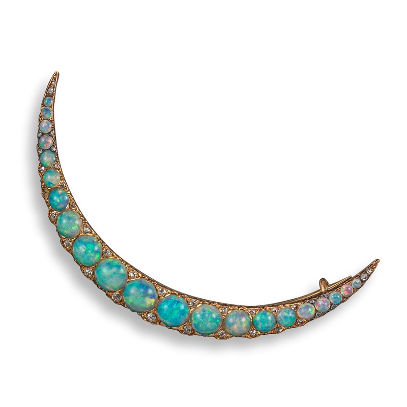 A Victorian open crescent brooch, set with graduated opal cabochons and diamonds in yellow gold, 6.5cm wide