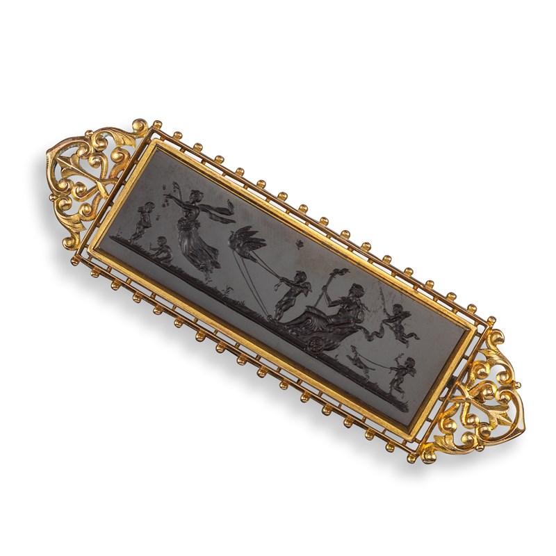 An agate intaglio brooch by Tiffany & Co, depicting Aurora's procession within gold scrolling and pellet border, 7.8cm wide