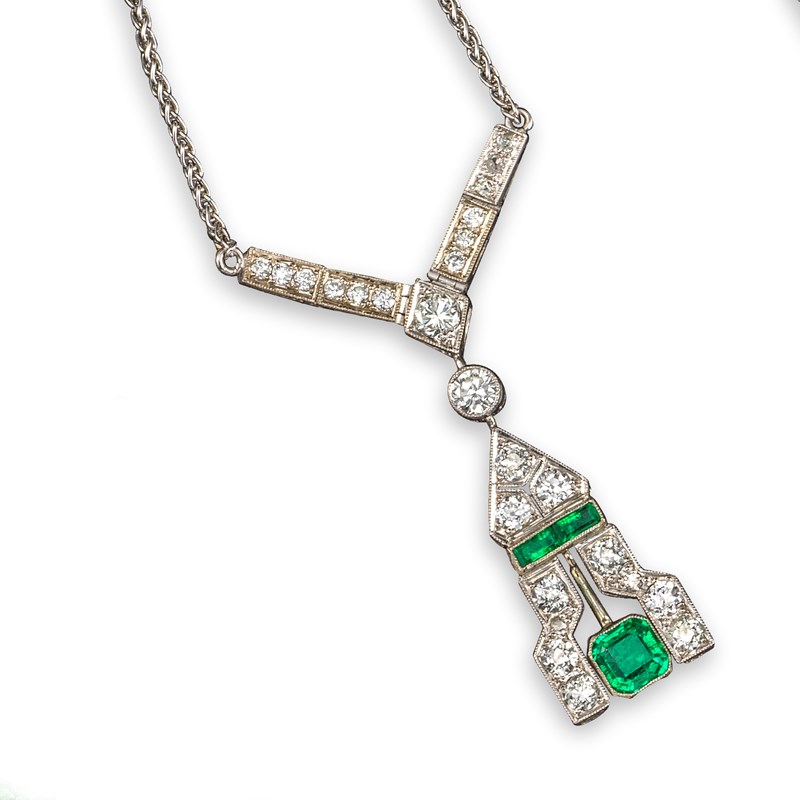 An emerald and diamond pendant, the hinged chevron-shaped upper section set with round brilliant-cut diamonds and suspending a geometric pendant set overall with old circular-cut diamonds, accented with baguette-shaped emeralds and an emerald-cut emerald drop, in white gold, 5cm high, on a fine-link white gold neckchain, 45cm long
