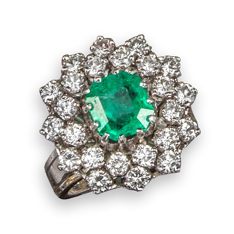 An emerald and diamond cluster ring, the emerald-cut emerald weighs approximately 1.70cts and is set within a surround of round brilliant-cut diamonds in white gold, size M 1/2