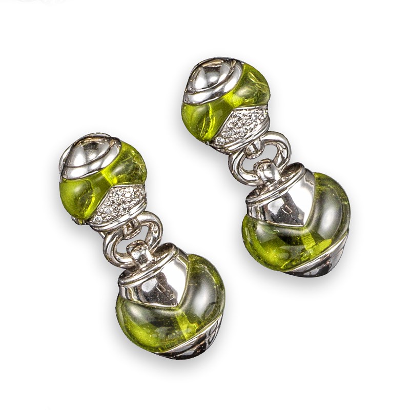 A pair of peridot and diamond drop earrings, set with fancy-shaped cabochon peridots and pave-set with circular-cut diamonds in white gold, with retractable posts, clip fittings, 3cm high