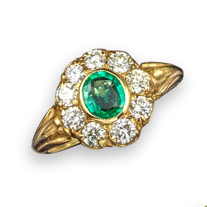 An emerald and diamond cluster ring