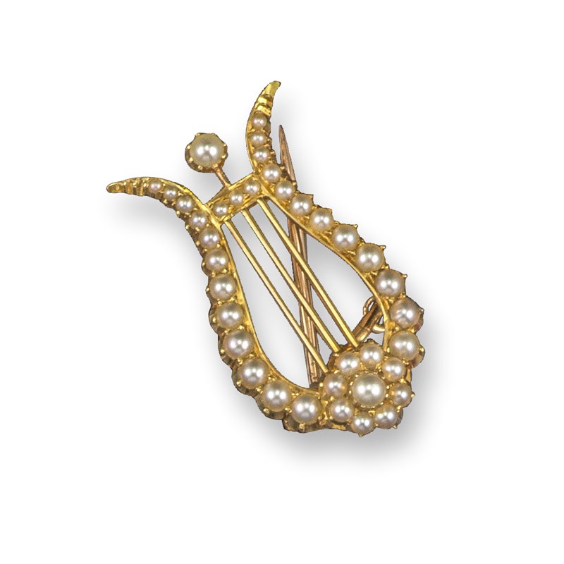 A Victorian seed pearl-set gold lyre brooch, realistically formed in closed back setting, 2.8cm high, fitted case