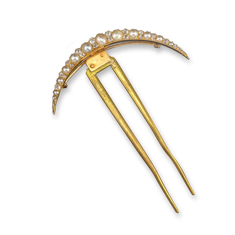 A late Victorian pearl and diamond open crescent brooch, alternately-set with pearls and pair of diamonds in yellow gold, 5.7cm wide, with detachable hair comb