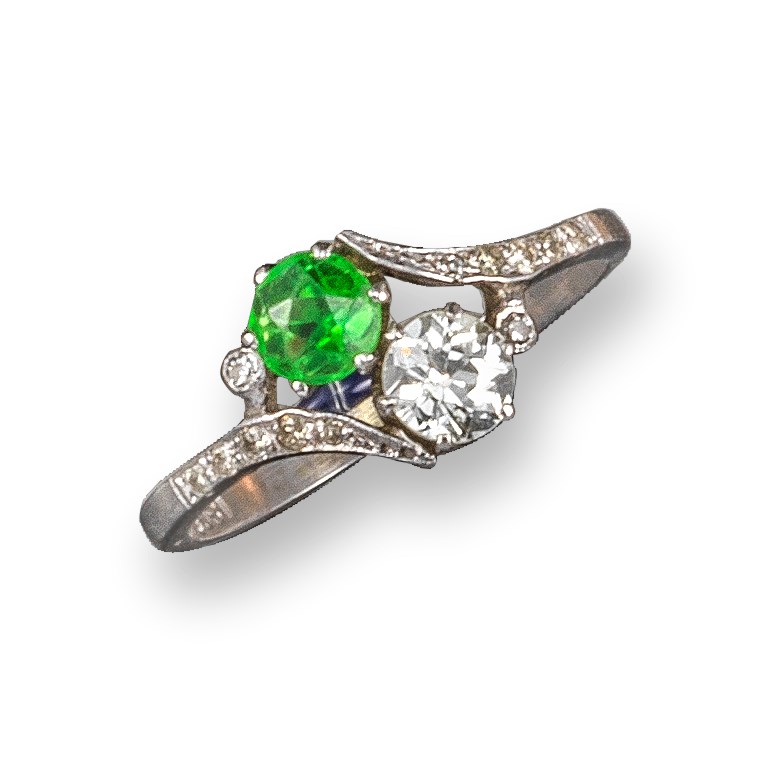 A diamond and garnet crossover ring, set with an old circular-cut diamond and circular-cut green garnet, in a white gold crossover mount set with small circuluar-cut diamonds to the shoulders, size N