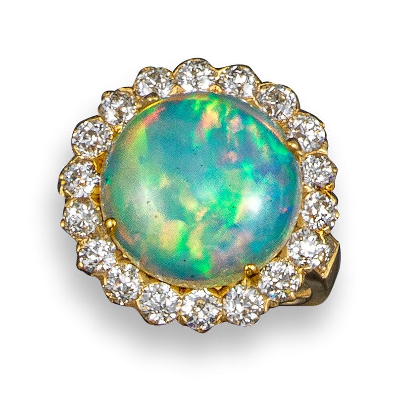 An opal and diamond cluster ring by Tiffany & Co, the opal cabochon set within a surround of old circular-cut diamonds in yellow gold, size P