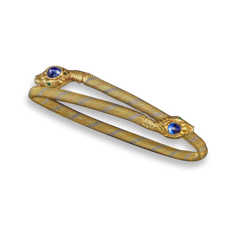 A Victorian gold double-headed snake bangle, each head set with a sapphire cabochon and emerald eyes on bi-colour gold twisted rope bangle, 5.2cm inner diameter